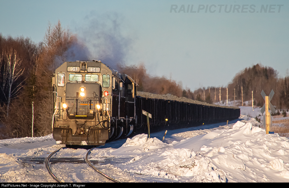The rising sun has just crested above the treetops soaking this wintery scene in a yellow glow as Northshore Mining's daily 0600 job with three of their 50+ year old ex-CN grey SD40s powering 80 loads of ore lean into a small curve at "Pond Crossing" road on Valentines Day 2020. Tucked deep in the remote backwoods of Minnesota's Superior National Forest, the NSM operates a single, 47-mile long stretch of railroad running trainloads of crude Mesabi ore between the mines at Babbitt to their processing plant and shipping port in Silver Bay off the banks of Lake Superior. Once arrvied, these rotary dump hoppers will be unloaded and this low grade ore will be processed into taconite pellets before being loaded onto a ship for transportation across the waters of the Great Lakes to a steel mill. Currently, the ship season is closed but trains don't stop running as the product is stockpiled and stored at the docks in Silver Bay until the freighters resume normal shipping operations in late March. The temperature on this morning was rather chilly, -30 with a -44 degree wind chill to be exact, and that cold air carried the roar of these three EMDs for miles and their sounds climbing upgrade blissed the ears for a near 10 minutes before their arrival to our location at this seldom used road crossing. Normally running at 150 cars in length, due to the severe cold, consist sizes were cut nearly in half to 80 cars in favor the train's air brake system.