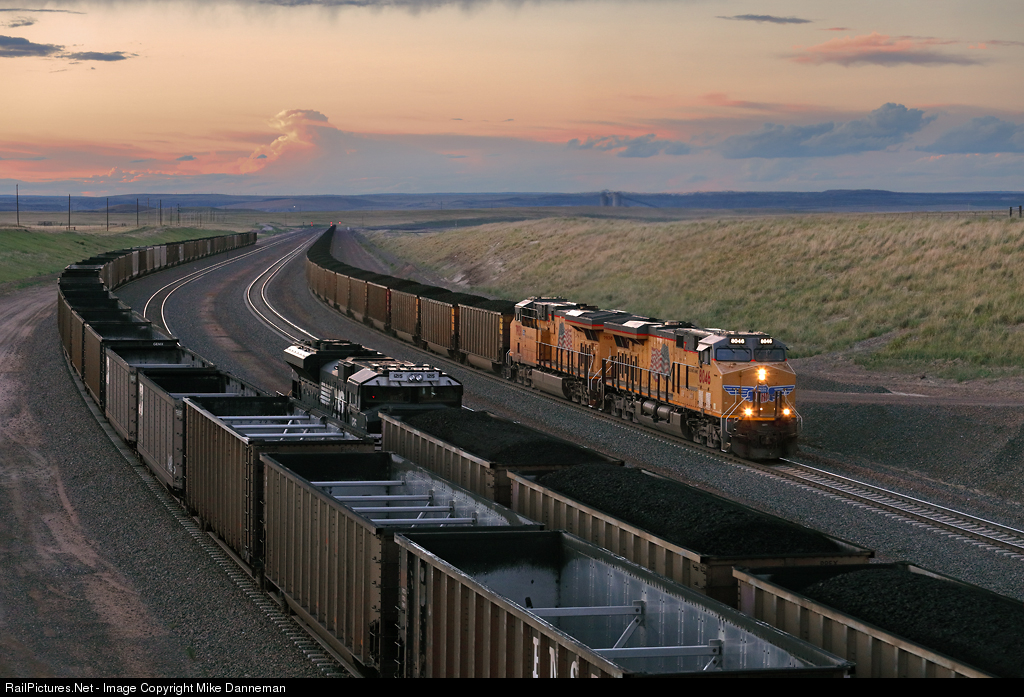 It’s 8:47 p.m. as the sun sets in Wyoming’s Powder River Basin on June 21, 2020. A southbound Union Pacific coal train grinds to the crest of Logan Hill on Track 1, while a BNSF coal load picks up more speed topping the hill as the Norfolk Southern EMD SD70ACe DPU passes the head end of the UP train. Stored coal gons are strung out in places between Bill and Converse Junction, including here at Logan on Track 4.