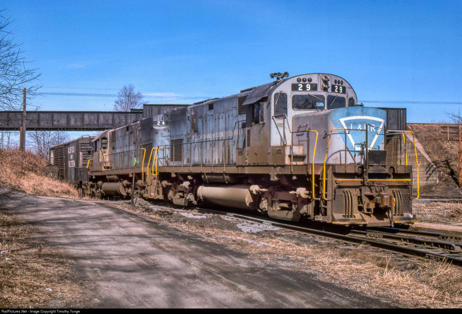 | L&HR 29, an Alco C-420, leads a freight at Greycourt, NY, on March 28, 1975. The bridge above the train is the EL. |