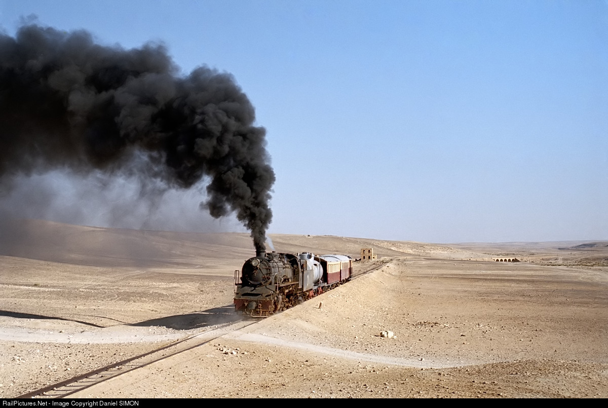 The oil fired Mikado #51 (Jung 1955) hauling a passenger train has just passed the remains of the Sawaka station on the way from Qatrana north through the stone desert to Amman.