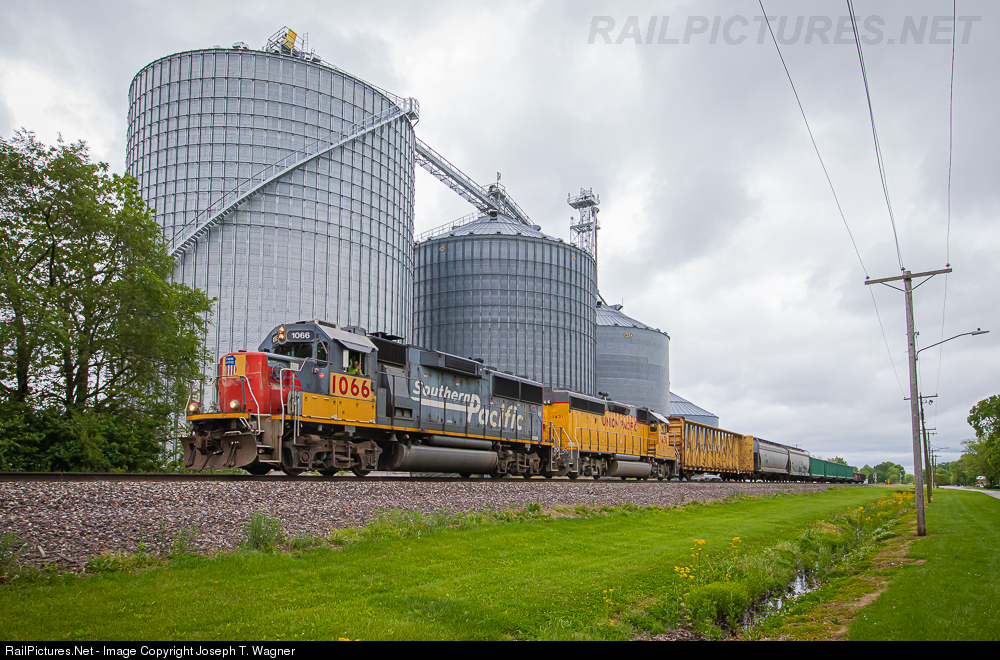 With its work complete at there southern most customer, UP local LSB54 20, and a more than enthusiastic conductor, waste no time returning back the way they came seen here rolling north beneath the large grain bins of the M&M Service Company complex in Irving, IL on an overcast mid-May morning. A paltry nine car consist is all that makes up today's train on their homeward bound trip up the Pana Sub back to Villa Grove including an empty centerbeam from Hixson Lumber in Hillsboro, two empty grain hoppers pulled from the elevators at Cadwell and six loaded tie gondolas that will be soon be left behind at Findlay. On-duty before most are out of bed, 0500, this job works six days a week out of Villa Grove covering industries along three different subdivisions, running as far south as Shelbyville (Salem) and/or Hillsboro (Pana) on Mon-Wed-Fri and making northbound runs as far as Grant Park (Villa Grove) on Tuesdays and Thursdays, saving Sunday for whatever is needed. Product of June 1991, 29-year old Southern Pacific veteran #1066, one of only four EMD GP60s still left wearing the Scarlett red and black colors of its former fallen flag, has then been paired at the hip with repainted ex-SP roster mate #1431 on this "Local 54" for over two months serving eastern Illinois on part of the St. Louis Service Unit. With a temporary shutdown of the railroad's Jenks Shops in North Little Rock due to COVID-19 economical decline, this unit has, in a way, received its "stay of execution" order since not many locomotives are currently being painted.
