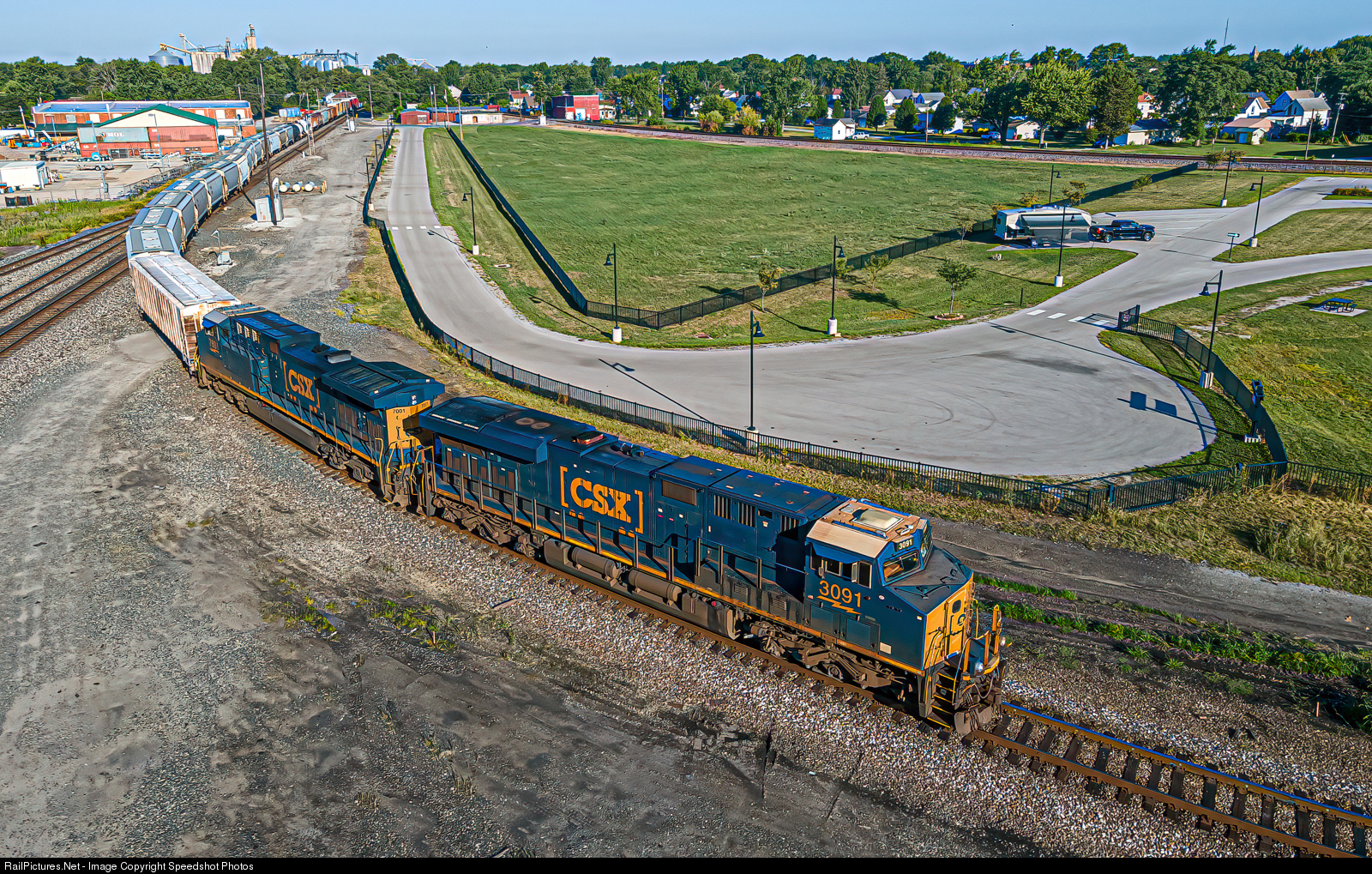 | CSXT 3091 leads through Fostoria Triangle in front of the railman park , turning North on to the old B&O to head to Toledo Ohio on a early sunny Saturday morning |