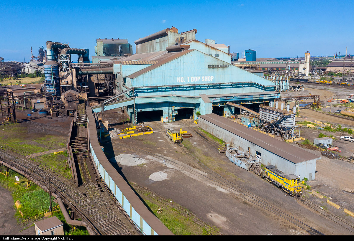 | Another major steel mill in Northwest Indiana is the Gary Works, located just off of Lake Michigan in Gary. A pair of their remote control switch locomotives prepare to go to work on a sunny morning at the No. 1 Bop Shop. Gary Works is owned and operated by US Steel. |