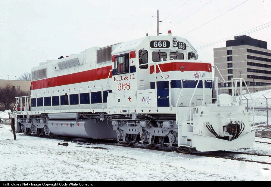 Elgin Joliet and Eastern SD38-2 668 in Bicentennial paint at Joliet IL January 1976. Built in November 1975, this unit was delivered from EMD in white paint and the red and blue were added by the EJ&E. Repainted back to the standard orange scheme in April 1977. Joe McMillan Photo from my Collection.