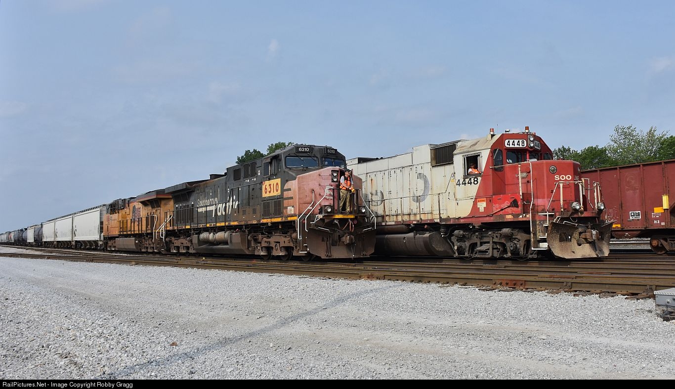 One of the last SP patched AC4400CWs arrives Nahant Yard, passing one of the last SOO geeps.