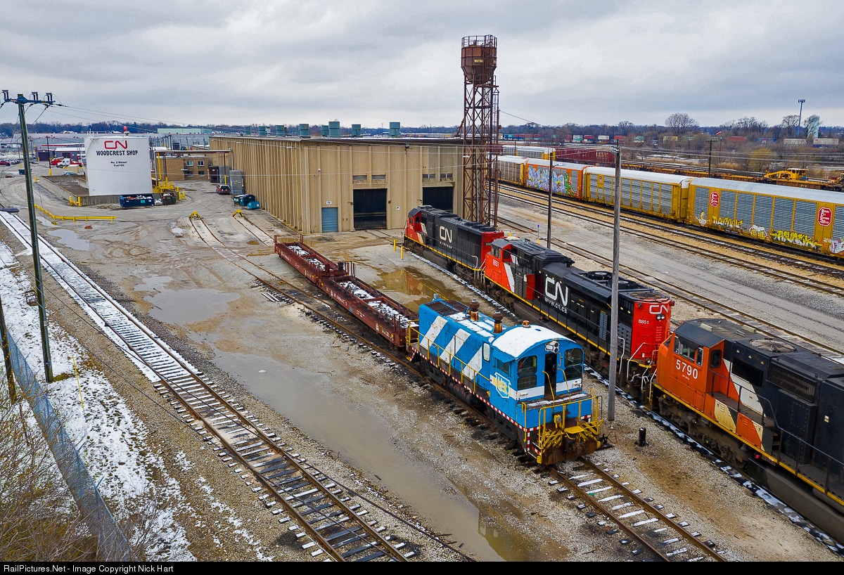 As various CN power sits around the shops at Woodcrest, an oddity is the star of the show. NREX #3, painted in a scheme for the United Grain Growers, holds down a few baretables. #3 is an SW1200 that was built in 1966 as the Houston Belt & Terminal (HBT) #35. Eventually, it will be sent to CN's Kirk Yard, where it will hitch a ride to Joliet and eventually, Motive Power Resources in Minooka, IL.