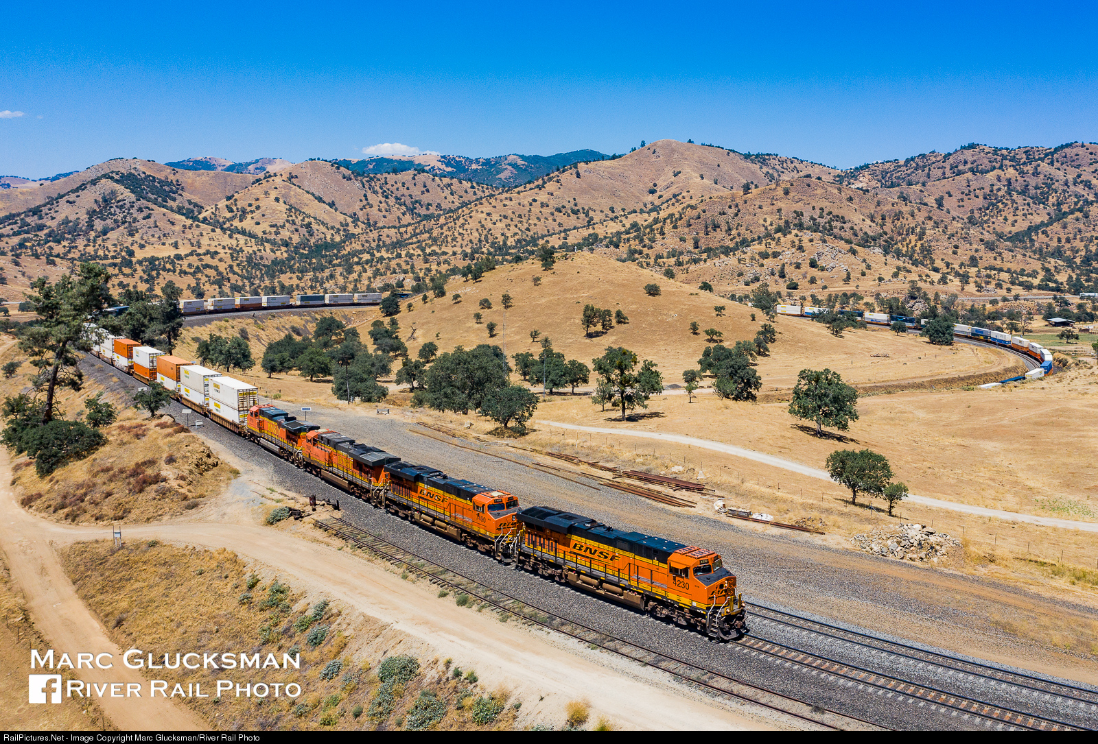 | Looper. BNSF Railway 4230 (ES44C4) leads a four pack of orange GEVOs and a lengthy double-stack train of containers out of Tehachapi Loop in Tehachapi, California on the afternoon of July 23, 2020. The loop is approximately 3/4 miles long over which distance it changes 77 feet in elevation. Declared a National Historic Civil Engineering Landmark in 1998, it attracts as many fans today as ever. |