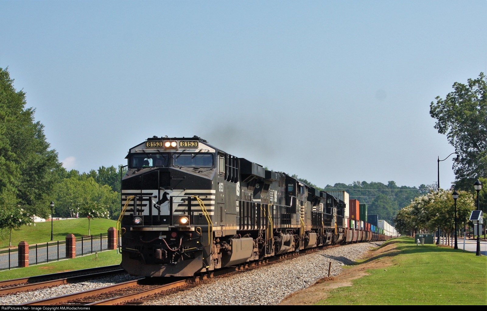 | Running on time from Charlotte with loads of domestic and a mix of international containers, 221 runs alongside Main Street in Buford, GA on a sunny yet very hot morning. |
