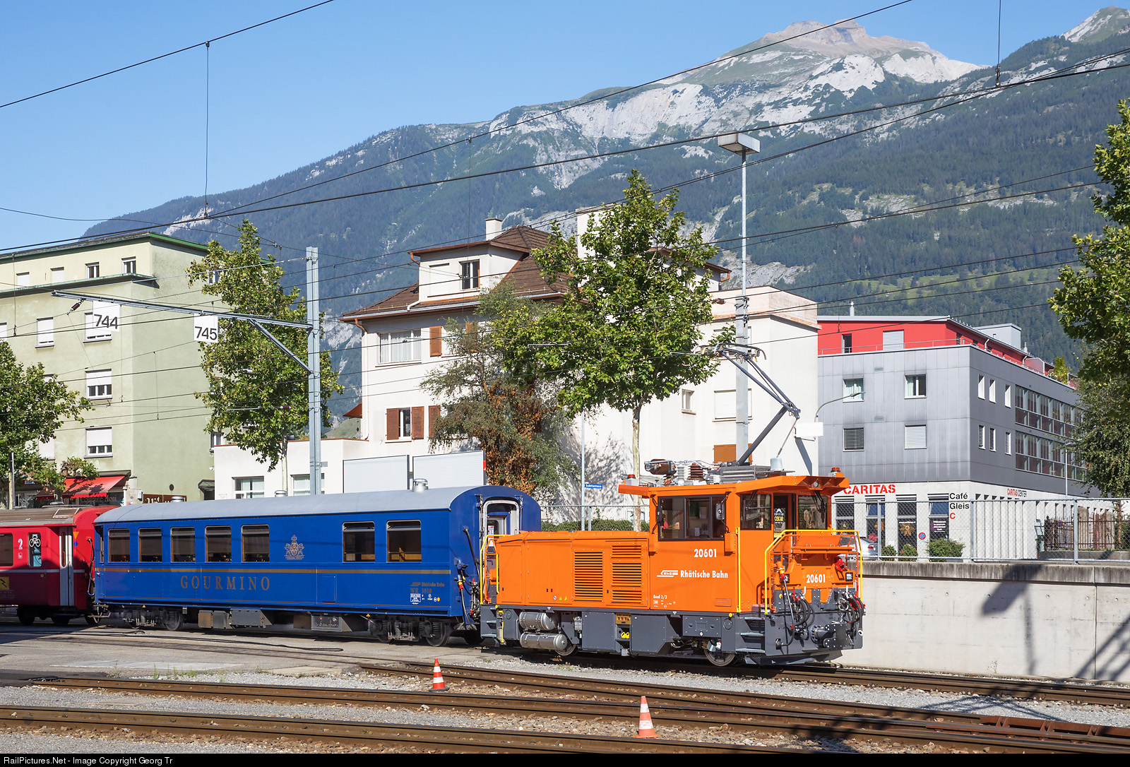 | Geaf 2/2 # 20601, the new hybrid electro/battery shunter of the RhB, is waiting with dining car WR # 3810 in Chur. |