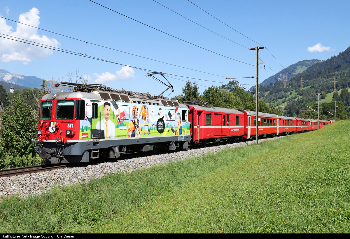 | The locomotive Ge 4/4 II 611, painted in the publicity paint scheme for Login, is pulling the RE 1749 from Landquart to Disentis/Mustér. |