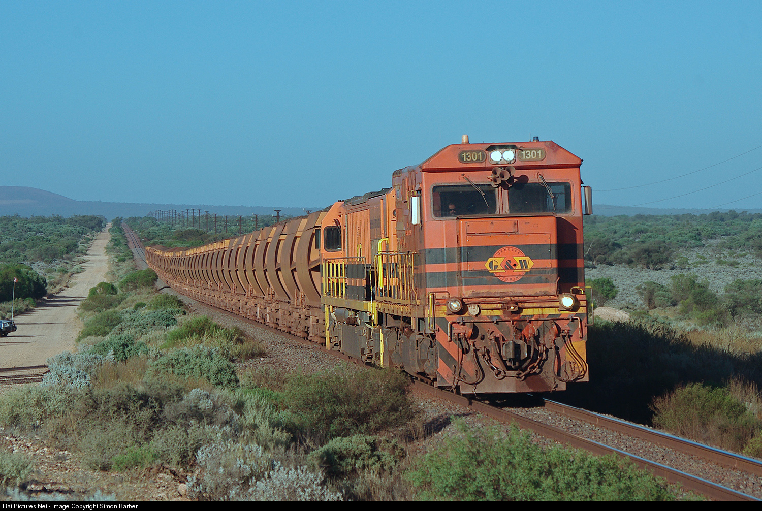 | 1301, a rebuilt G12B unit, and GWN001 work a loaded iron ore train towards Whyalla. |