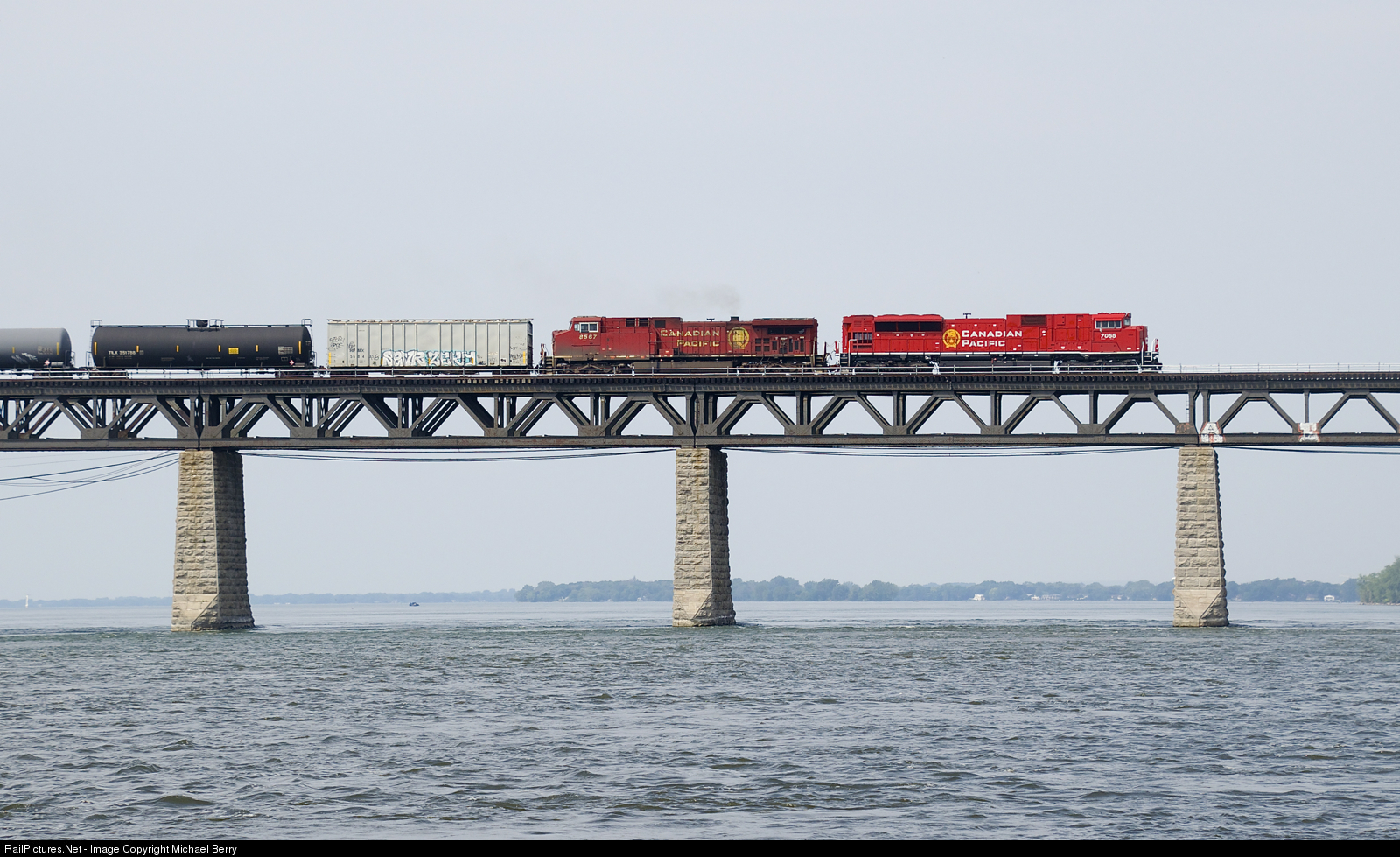 Freshly rebuilt CP 7055 and grungey CP 8567 present a contrast in appearance as they lead empty ethanol train CP 651 over the St. Lawrence River on a muggy morning.