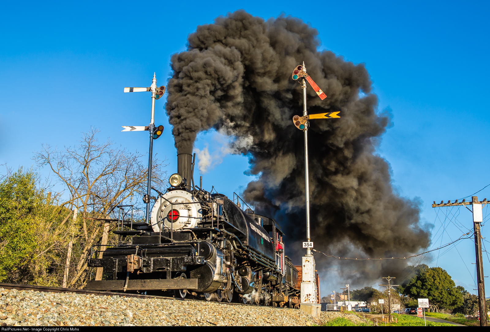 Clover Valley Lumber Company No. 4 splits the Semaphore Signals at the west end of Sunol Station. The event was a Lerro Productions photo shoot at the Niles Canyon Railway.