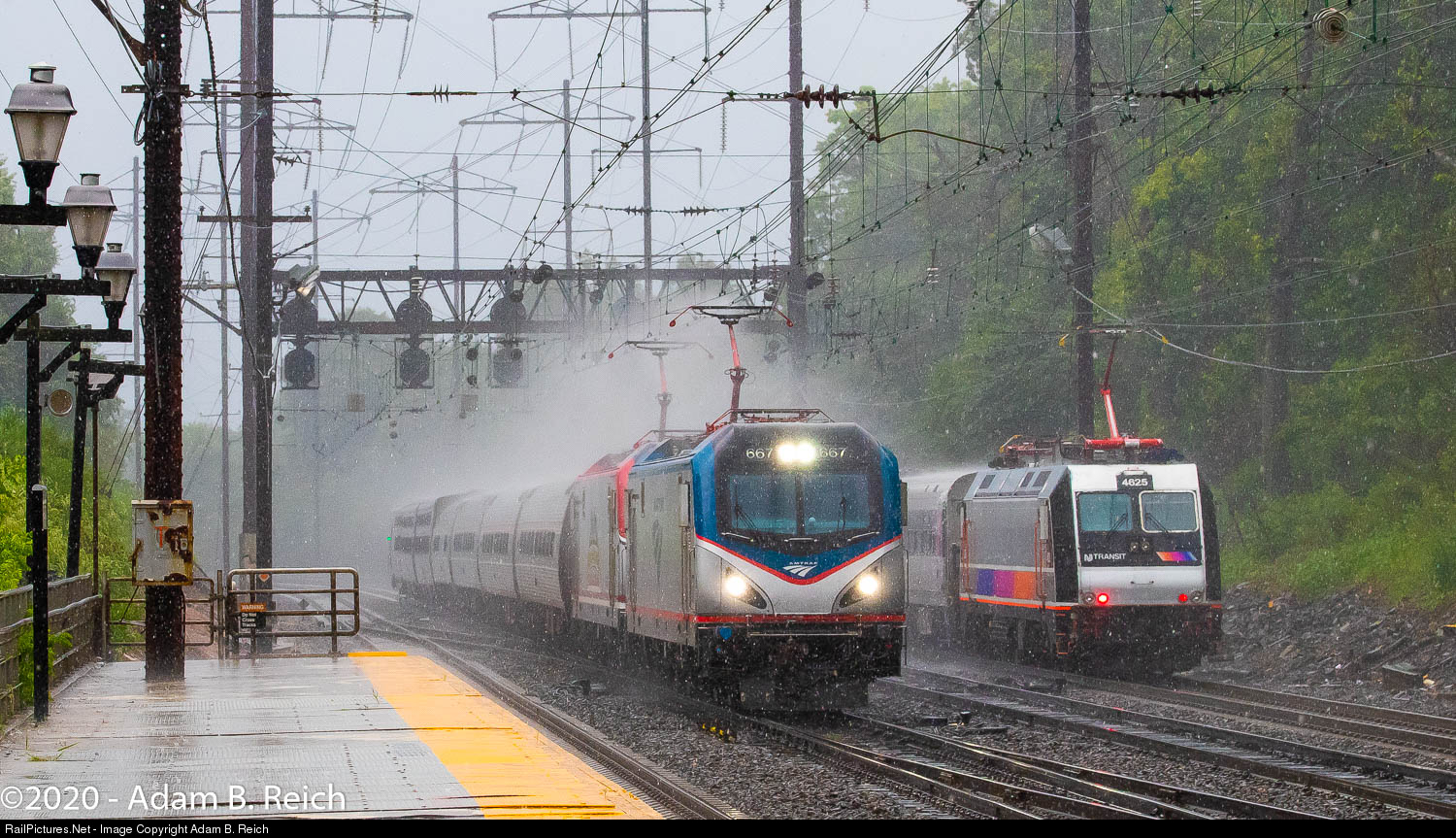 The Rain on the Main: A heavy downpour hits Metuchen, New Jersey as Amtrak's Crescent and NJ Transit Northeast Corridor Line Train #3852 meet just east of the station on Wednesday, August 12, 2020. Note the doubleheader on the Amtrak train with the distinctive Veterans ACS-64 #642.
