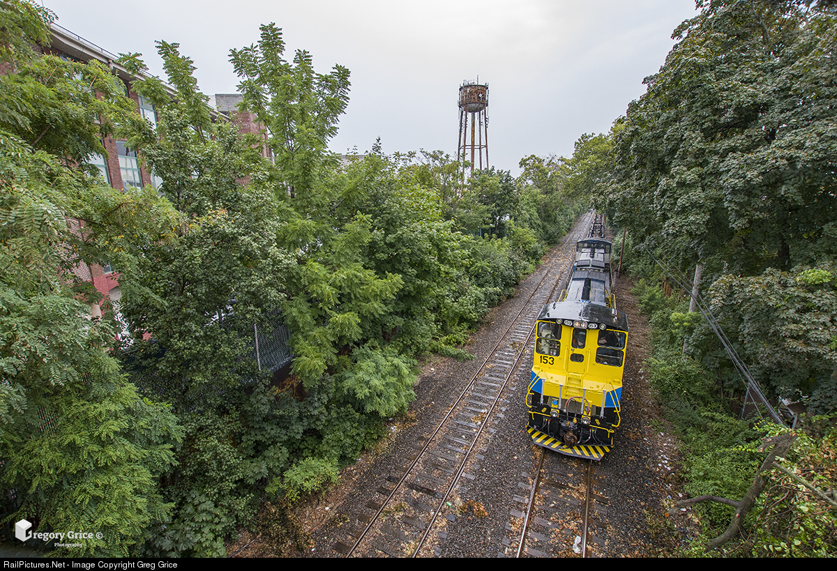 A Long Island Rail Road work train passes the former Atlas Terminal on the Lower Montauk in Glendale, NY while on its way to Fresh Pond Yard. Atlas Terminal was once a huge rail-served industrial complex that featured several businesses and even it's own small switching locomotive. The land was taken over by another company, re-branded as "Atlas Park" and is now an upscale shopping center. The original water tower still stands as a memory of what once was. |