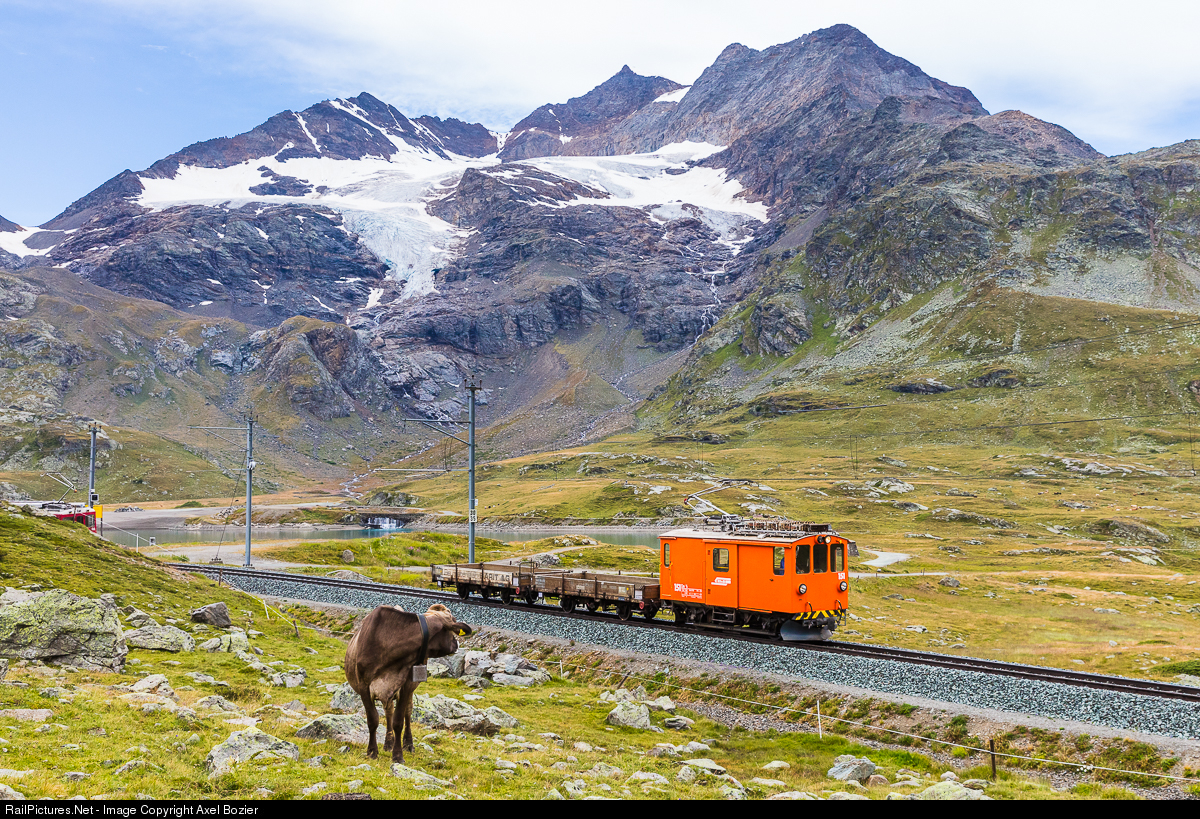 | Baggage railcar De 2/2 #151 of the Rhaetian Railway with a short freight train in front of the Cambrena Glacier. This baggage railcar was built in 1909 for the Bernina Bahn. It was fitted with a new body in 1962 and has carried this orange livery since the early nineties. It is still used as a shunting locomotive but it will be retired soon. Private photo charter. |