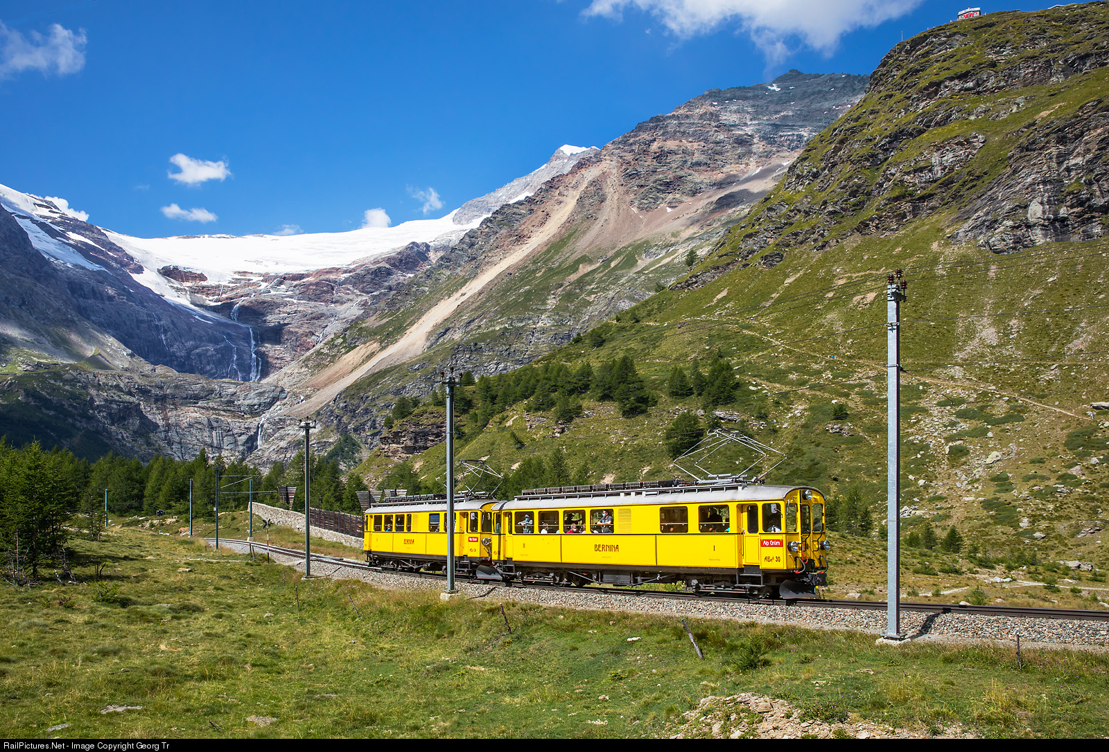 | In front of the Palü glacier, the east peak of Piz Palü (3882 meter a.s.l.), Piz Caral (3420 meter a.s.l.) and Sassal Mason restaurant (sadly closed this season), the "Two Yellows" railcars ABe 4/4 # 34 and # 30 of the Rhaetian Railway are running as "Erlebniszug Alp Grüm" (Alp Grüm adventure train) EXT 2623 from Pontresina via the Bernina pass to Alp Grüm. The railcars were built in 1908/1911 by SIG and Alioth for the then independent Bernina Railway and were rebuilt several times since then. |