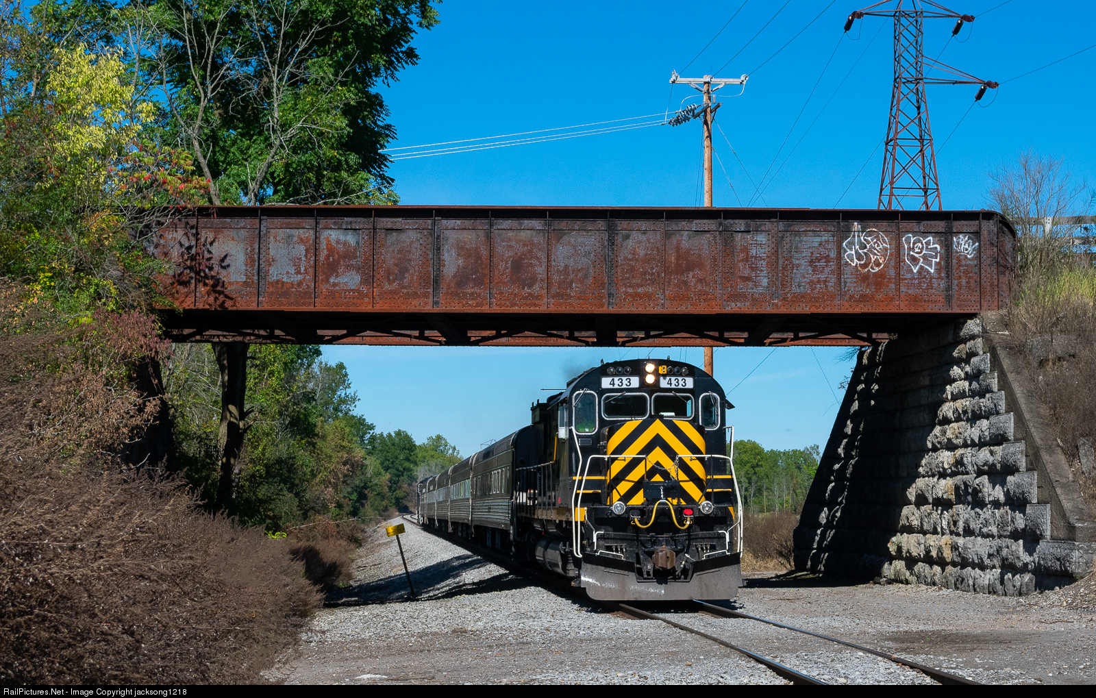 On October 5th, 2019, the Rochester and Genesee Valley Railroad Museum, with cooperation from the Livonia Avon and Lakeville railroad, ran excursion trains from Lakeville to Industry using the museum's classic NYC coaches. The train is seen here passing under the Lehigh Valley mainline, which is now a hiking trail.