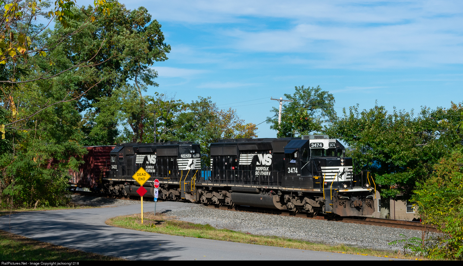 Norfolk Southern Corning - Geneva turn, symboled H06, is on its return run southbound as it crosses over Angus Point Rd on the shore of Seneca Lake in Angus, NY. Leading the train is NS EMD SD40-2 number 3474 (ex BN 7224) and NS EMD SD40-2 (ex CR 6516).