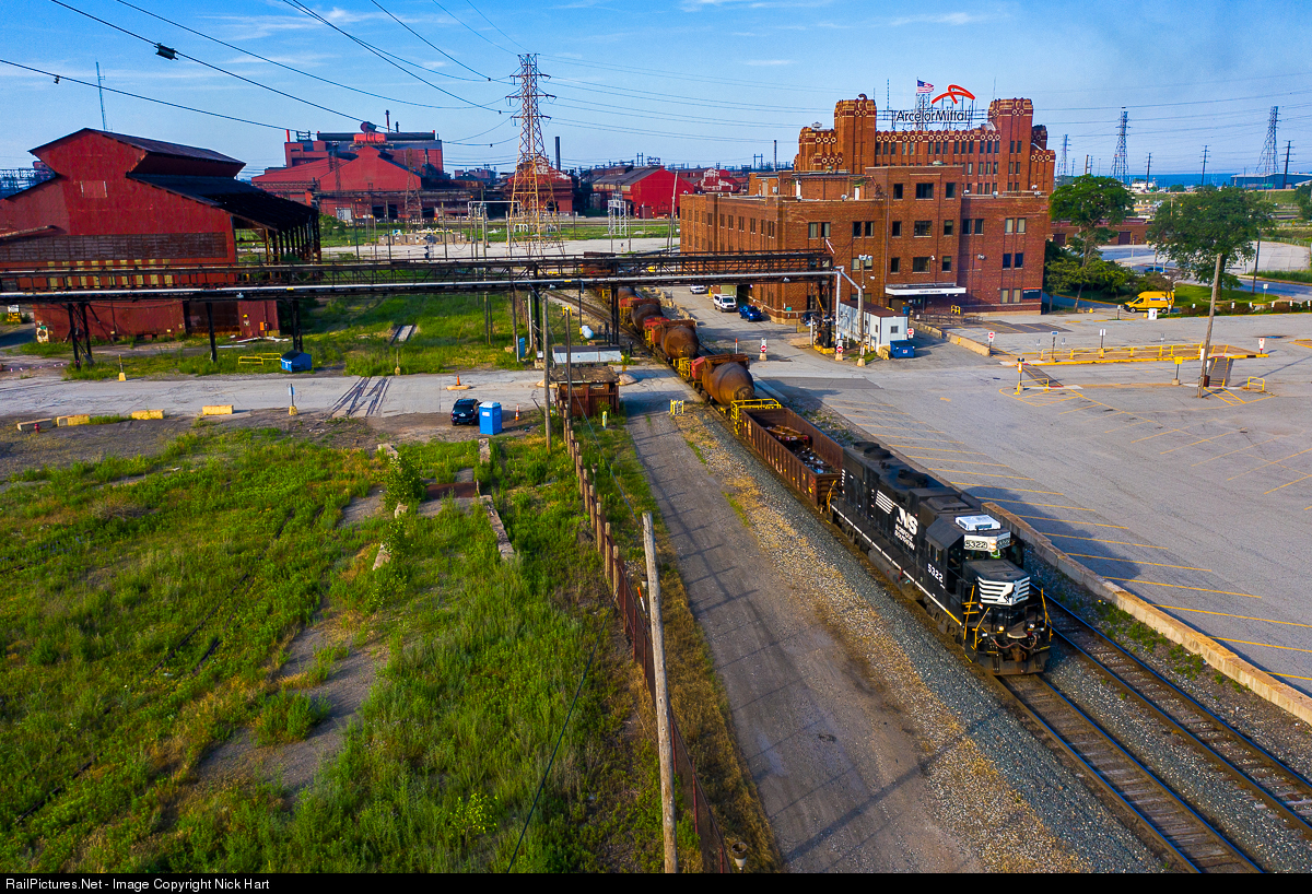 | Shortly after departing the IHB's Lakefront Yard, the fan favorite bottle train approaches CP 100 with an NS GP38-2 in charge. ArcelorMittal stands in the background. Before long, we'll be seeing IHB power leading these bottle trains as the contract waits to be handed over to the Harbor Belt. |