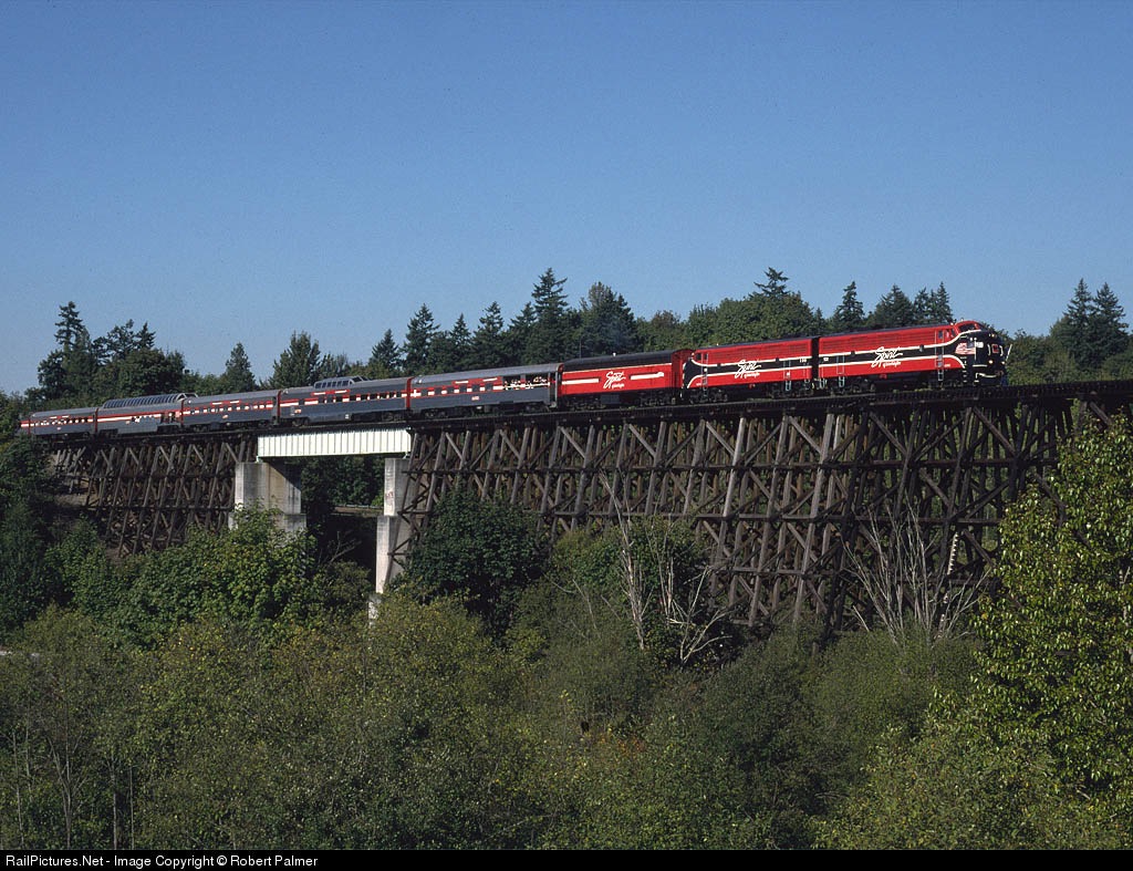 Spirit of Washington dinner train crosses a spectacular wood trestle. These units are now on the CZRY.