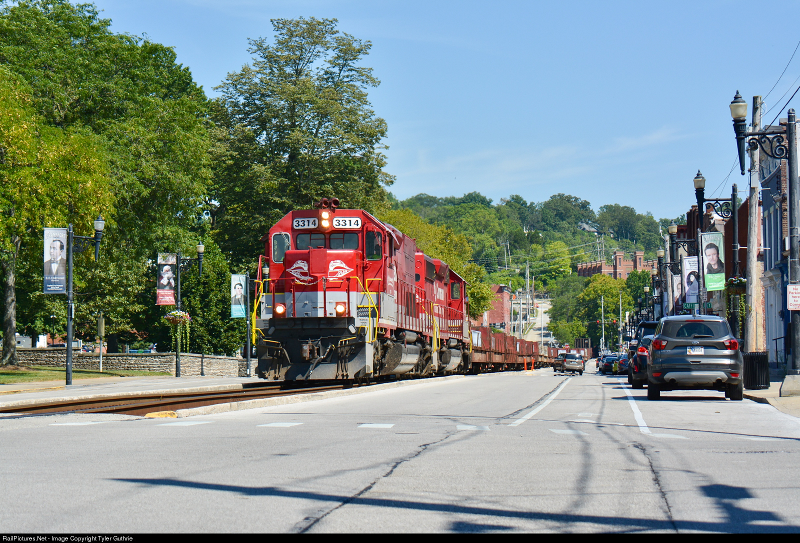 | RJ Corman's loaded aluminum ingot train runs down the street in Frankfort, KY, as the train makes its way towards Louisville. |