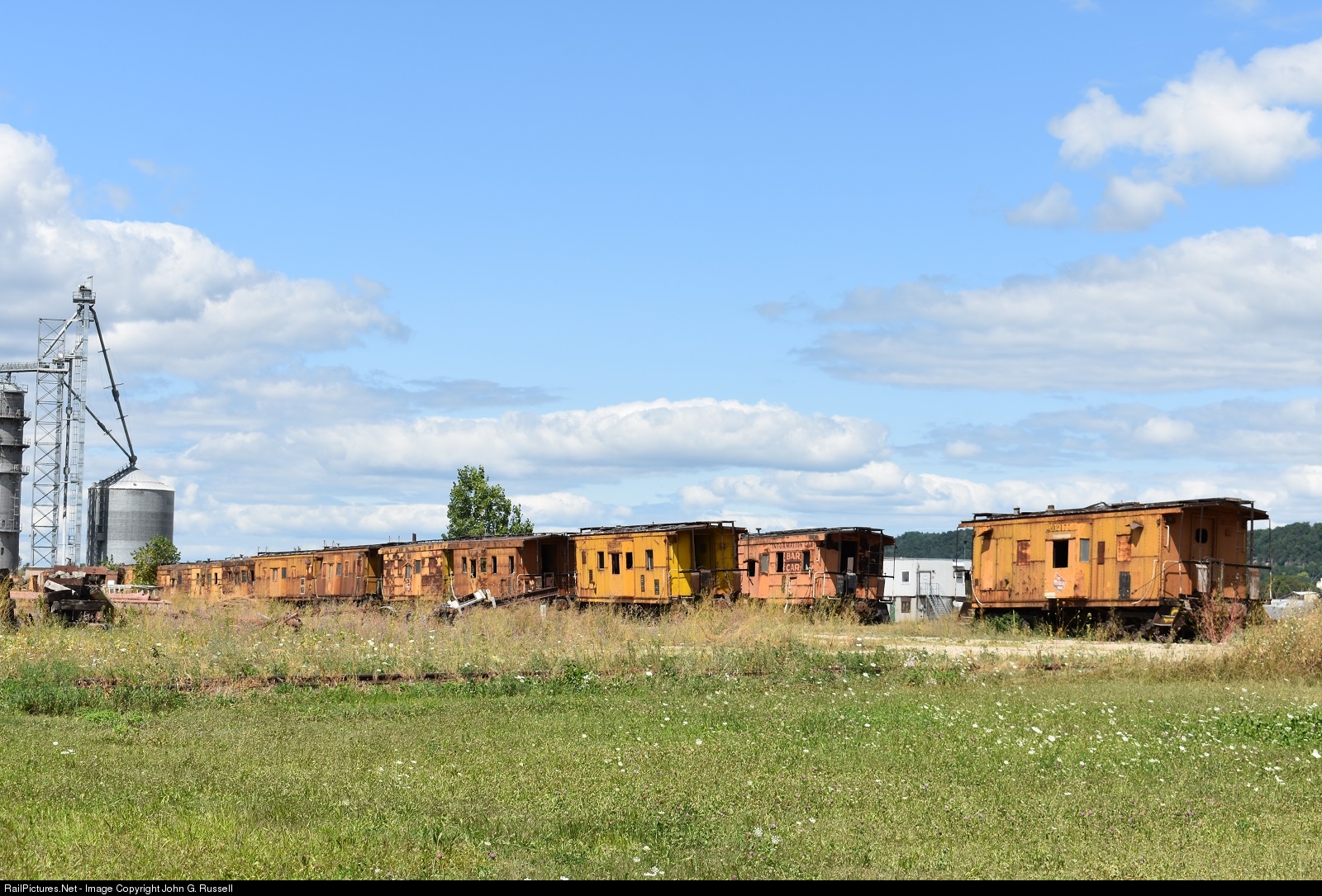 A gaggle of former Milwaukee Road Cabeese rust away on St. Feriole island, near a grain facility in Prairie du Chien.
