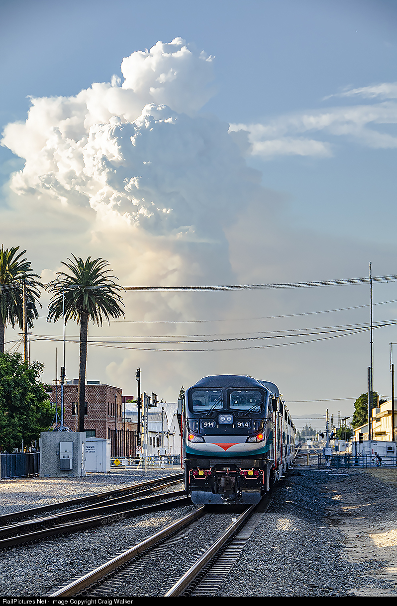 The "Ranch 2" fire was burning in the Angeles National Forest above Azusa, with the fire destroying 2,500 acres with just 3% containment as of Saturday morning. By afternoon, the fire had created a massive pyrocumulus cloud reaching 25,000- to 30,000-feet into the atmosphere. Meanwhile, thirty-five miles to the south, the last Metrolink train of the day on the carrier’s Orange County Line, number 667 (with F125 914 shoving), makes its way from Oceanside to Los Angeles. (Orange, California – August 15, 2020)