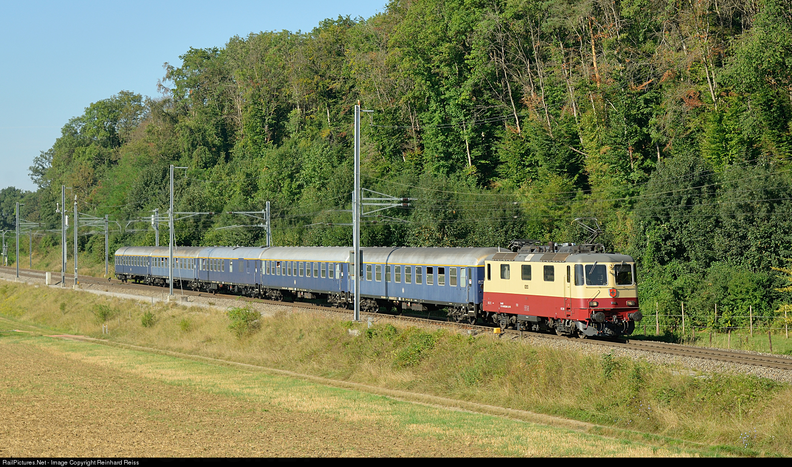 Former SBB Re 4/4 II 421 393 in "TEE livery" heads a charter train from Lyss to Schaffhausen.