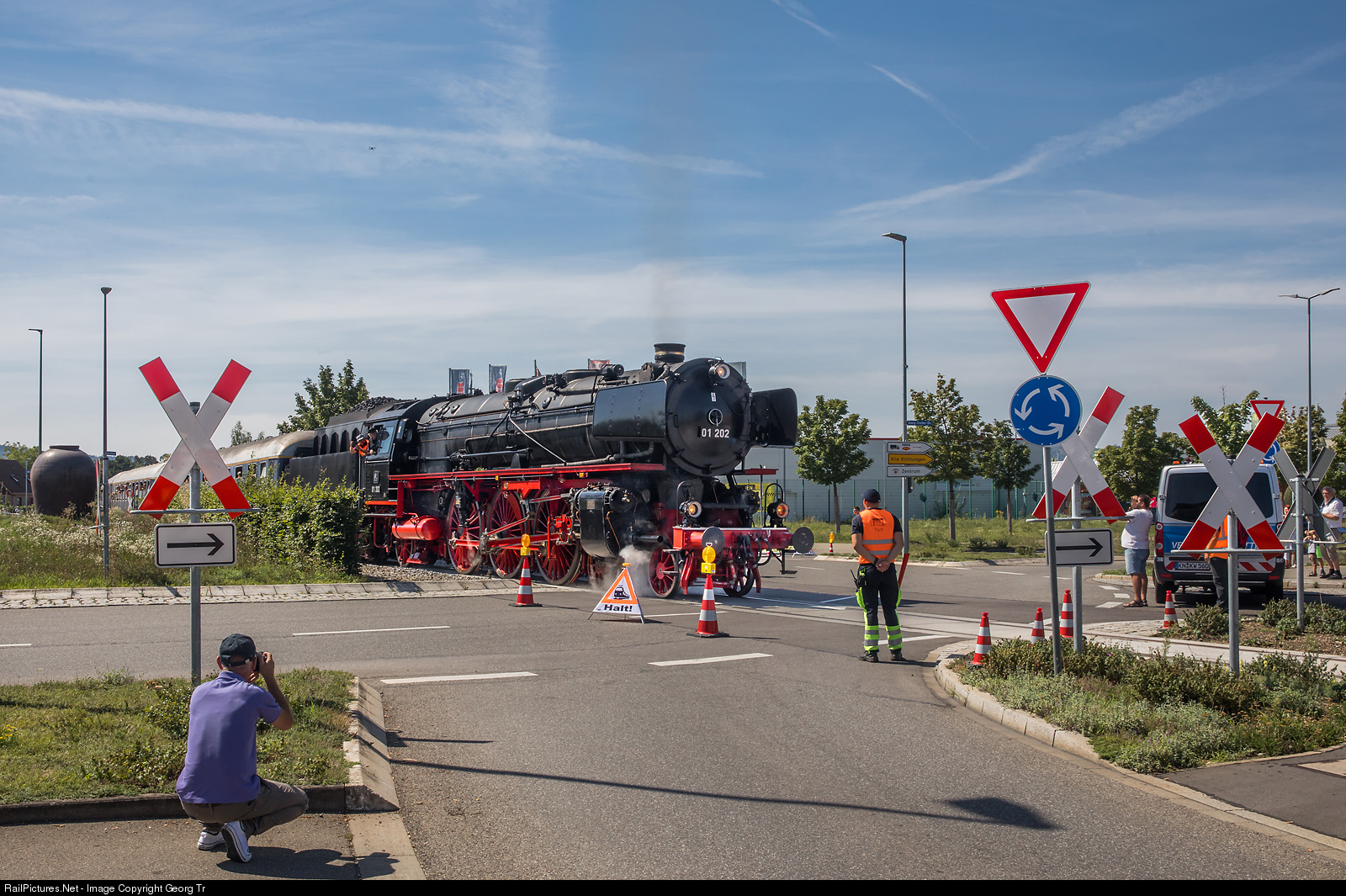 | Former Deutsche Bundesbahn express train steamlocomotive 01 # 202, based in Lyss BE, is running over the "Volksbank" traffic roundabout (crossing Georg-Fischer-Strasse/Güterstrasse) in Singen (Hohentwiel) with the re-opening train from Ramsen. It is the first passenger train since 51 years between Rielasingen and Singen. The 13,29 kilometer long line Etzwilen-Singen (Hohentwiel)/Germany was built by the Schweizerische Nationalbahn and opened in 1875. Later owned and operated by the SBB, but never electrified. Freight traffic with diesel locomotives ended in 1996 between Ramsen and Singen. Passenger train service between Etzwilen and Singen was discontinued in 1969 already. |