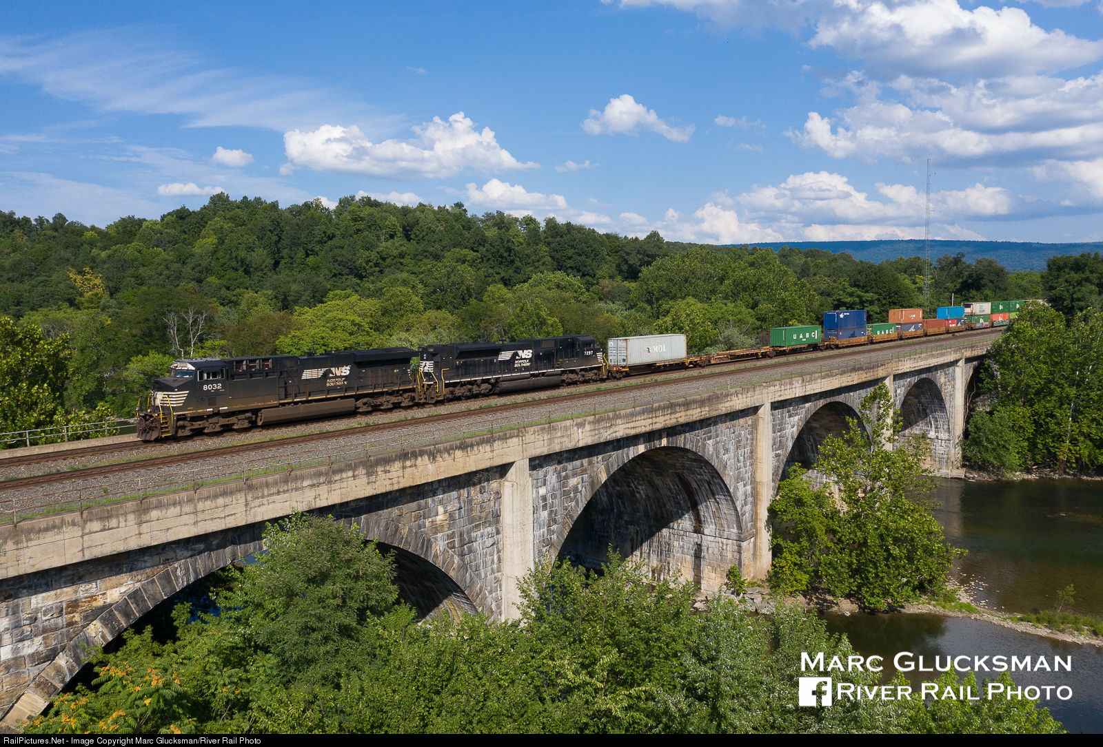 Classic Pennsylvania. As Norfolk Southern 23M (NS 8032, ES44AC leading) crosses the Juniata River in Mount Union, Pennsylvania on the afternoon of Friday, August 14 2020 one can hardly imagine how much freight has been carried over this 688 foot stone arch Kistler Viaduct since it opened in 1906. Constructed by the Pennsylvania Railroad, it was then operated by Penn Centra and Conrail before current owner Norfolk Southern.