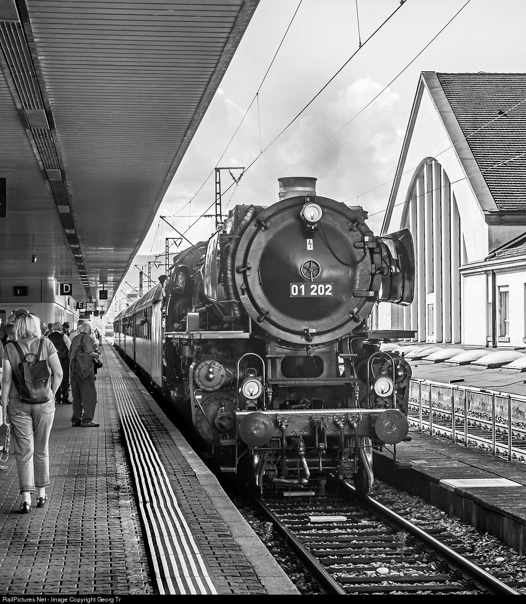 | 4-6-2 "Pacific" steamlocomotive 01 # 202 of association "Pacific 01 202" is entering Basel Badischer Bahnhof with a train of Zermatt Rail Travel from Lyss to Offenburg-Hausach-Donaueschingen-Tuttlingen-Singen-Schaffhausen. On the right the station building dating from 1913. |