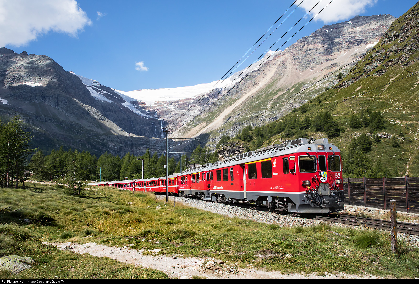 | Railcars ABe 4/4 ("Tw III/ABe Bernina railcars third generation) # 52 and # 54 in multiple control are pulling train 4640 from Tirano to St.Moritz on the 7.0 % grade above Alp Grüm towards the Bernina pass. In the background the Palü glacier, east peak of Piz Palü and Piz Caral. |