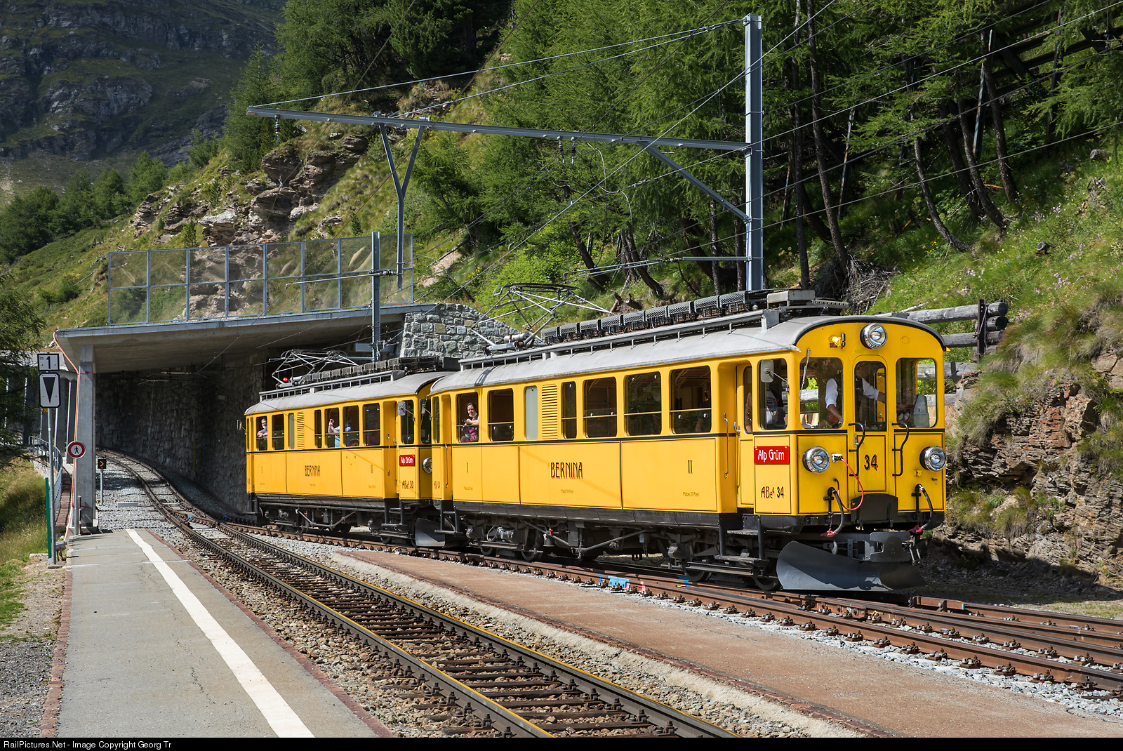 | Railcars ABe 4/4 ("Tw I/ABe Bernina railcars first generation) # 34 and # 30 in multiple control are entering Alp Grüm with the "Erlebniszug Alp Grüm" (Alp Grüm adventure train) EXT 2639 from Pontresina. The vintage railcars of the former Bernina Railway from 1908/1911 are circulating this summer on several days between Pontresina and Alp Grüm and vice versa, usuable with every valid ticket without supplement. |