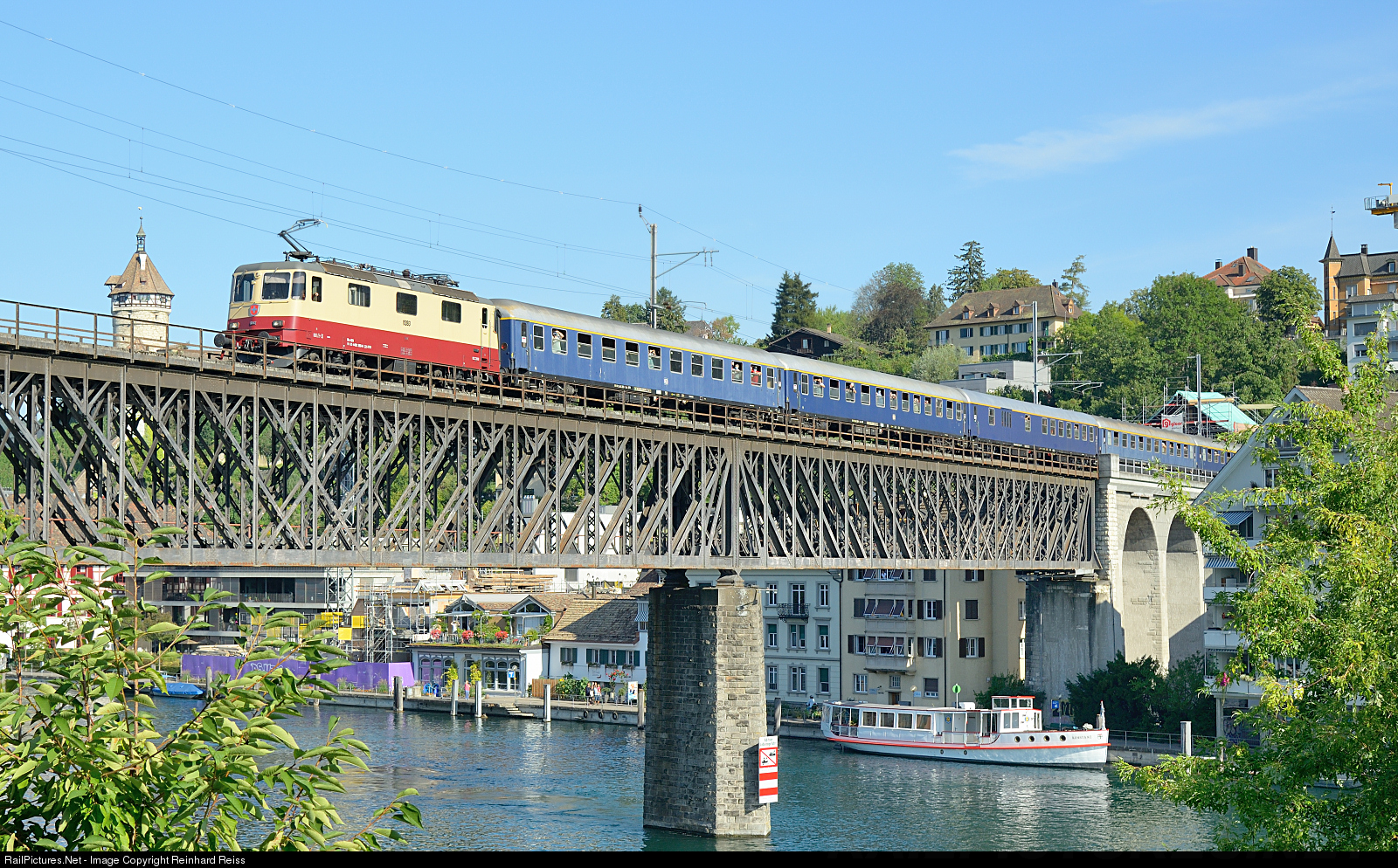 Former SBB Re 4/4 II 421 393 in "TEE livery" passes bridge over Rhine near Feuerthalen with a charter train from Schaffhausen to Etzwilen.