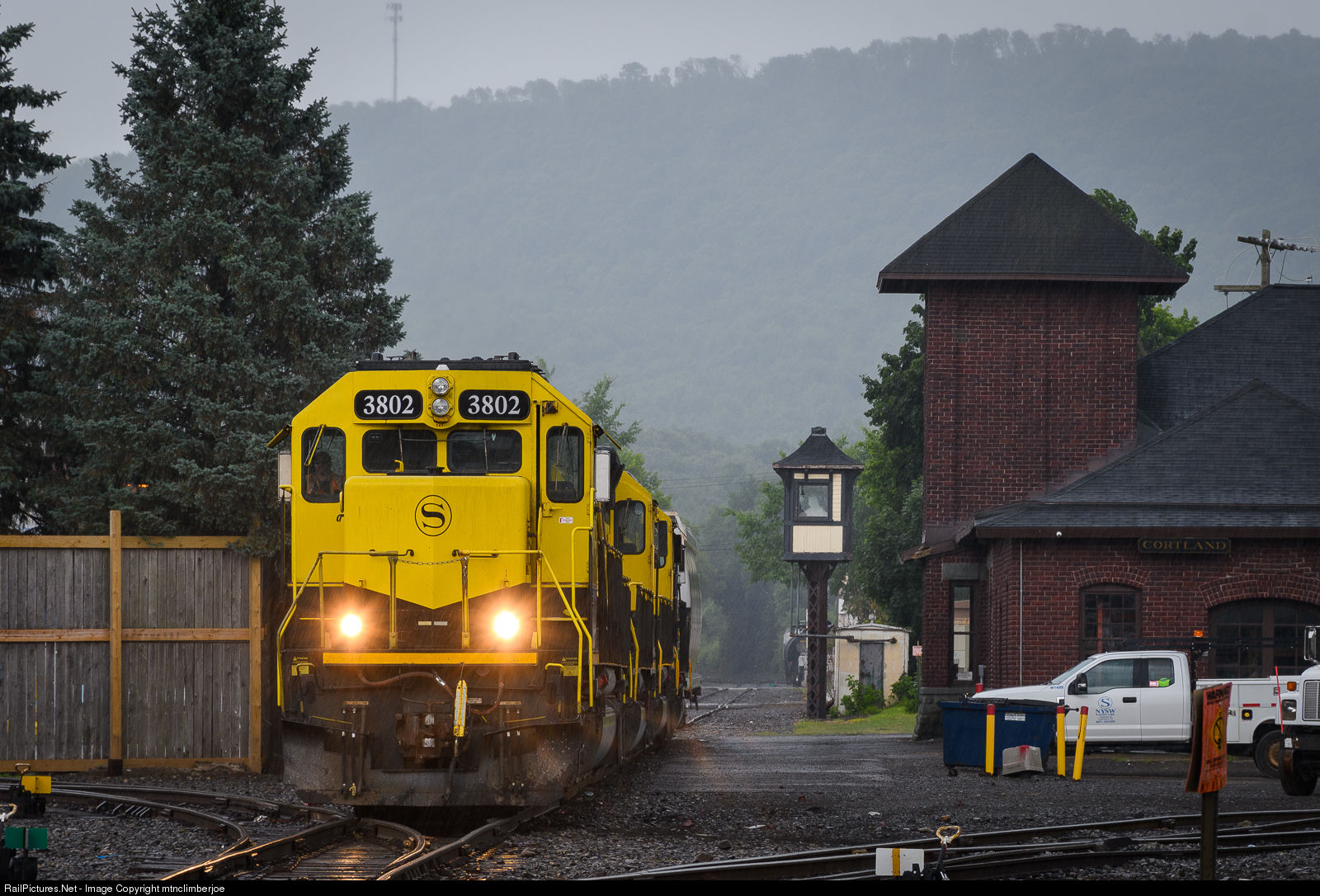 With just a few switching moves left after arriving in Cortland, New York, the skies open up and rain pours down on the New York, Susquehanna & Western's CL-1 as it shuffles a few cars in front of the former DLW station that serves as the office here.