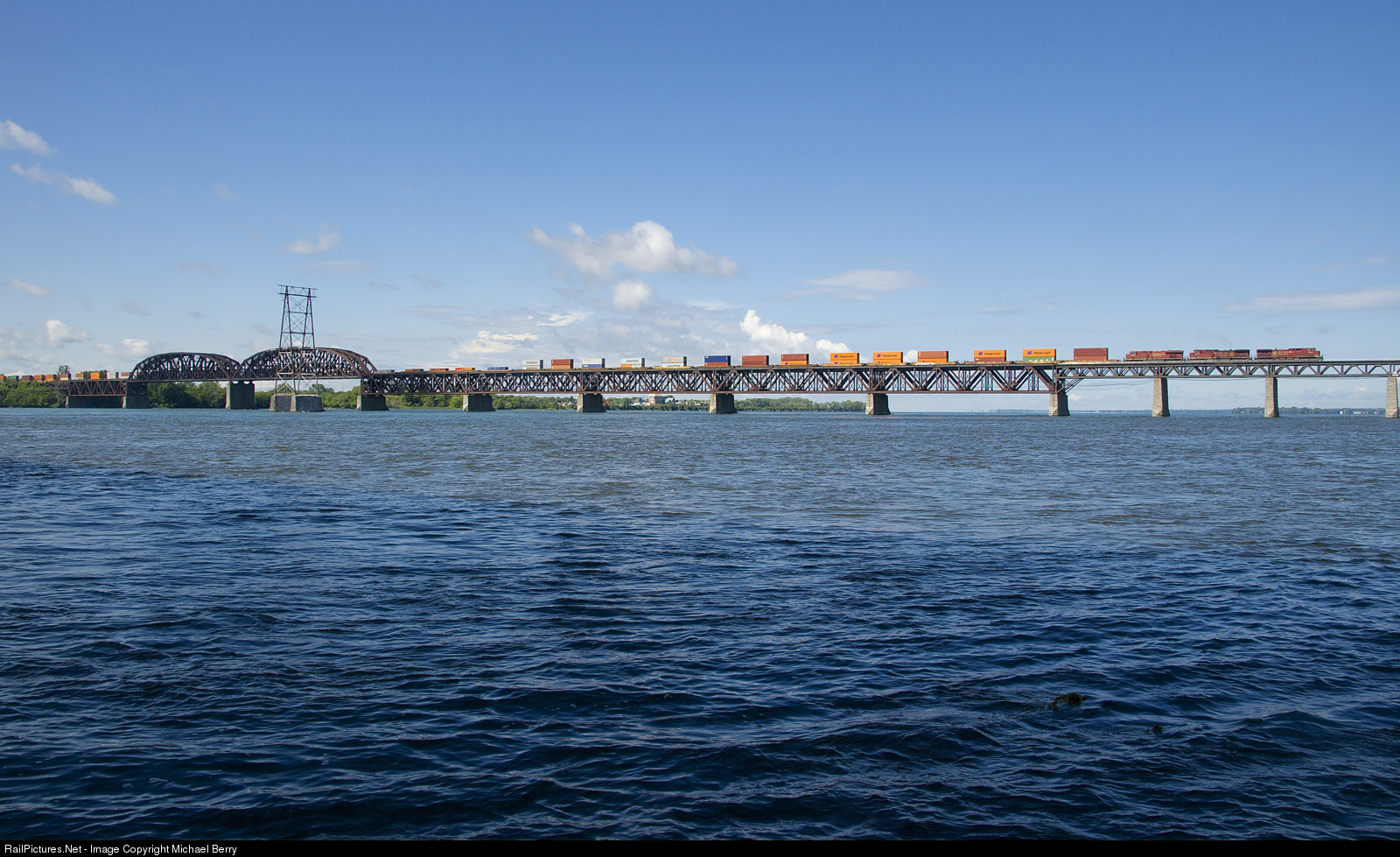 | Stacks from New Brunswick. Due to an ongoing strike in the Port of Montreal, CP has been moving intermodal traffic to and from the port of Saint John, New Brunswick using its recently purchased CMQ line and the NBSR. Here CP F95 has a trio of GE's leading a 100% intermodal train into Montreal. This bridge normally sees no intermodal trains. |