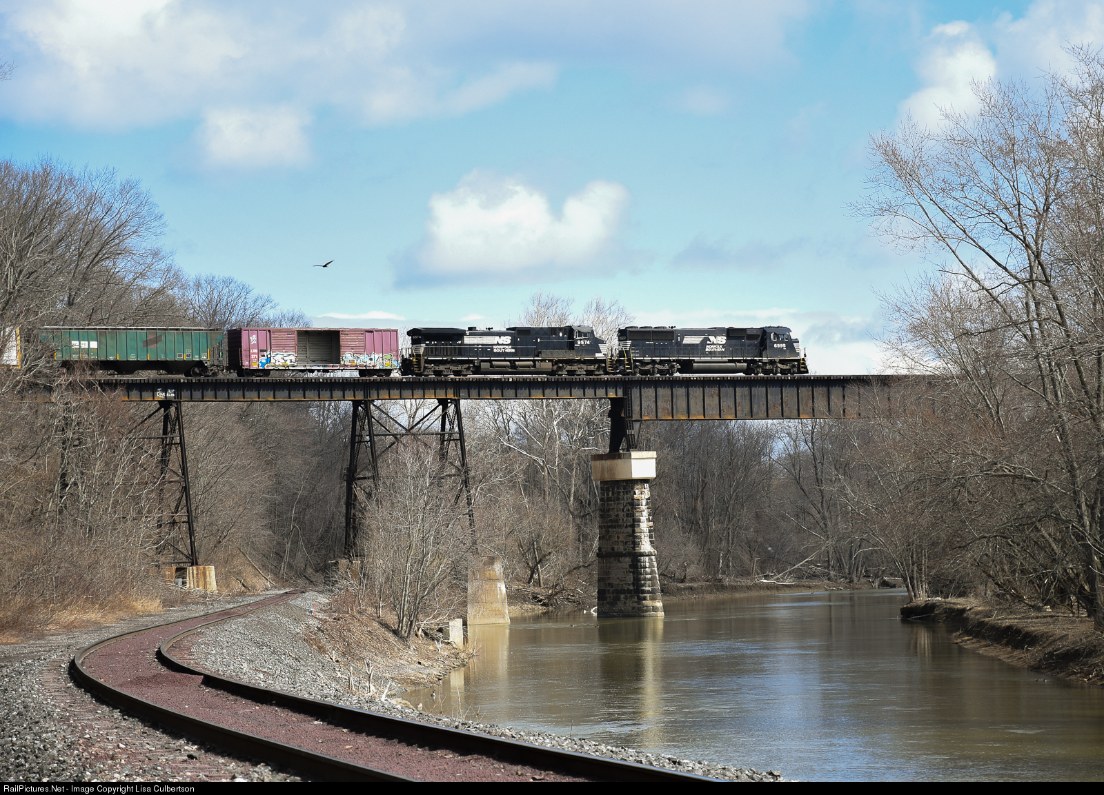 | The NS 14M, led by a rebuilt SD60E, crosses the trestle over the Conneaut Creek in Conneaut, Ohio. |