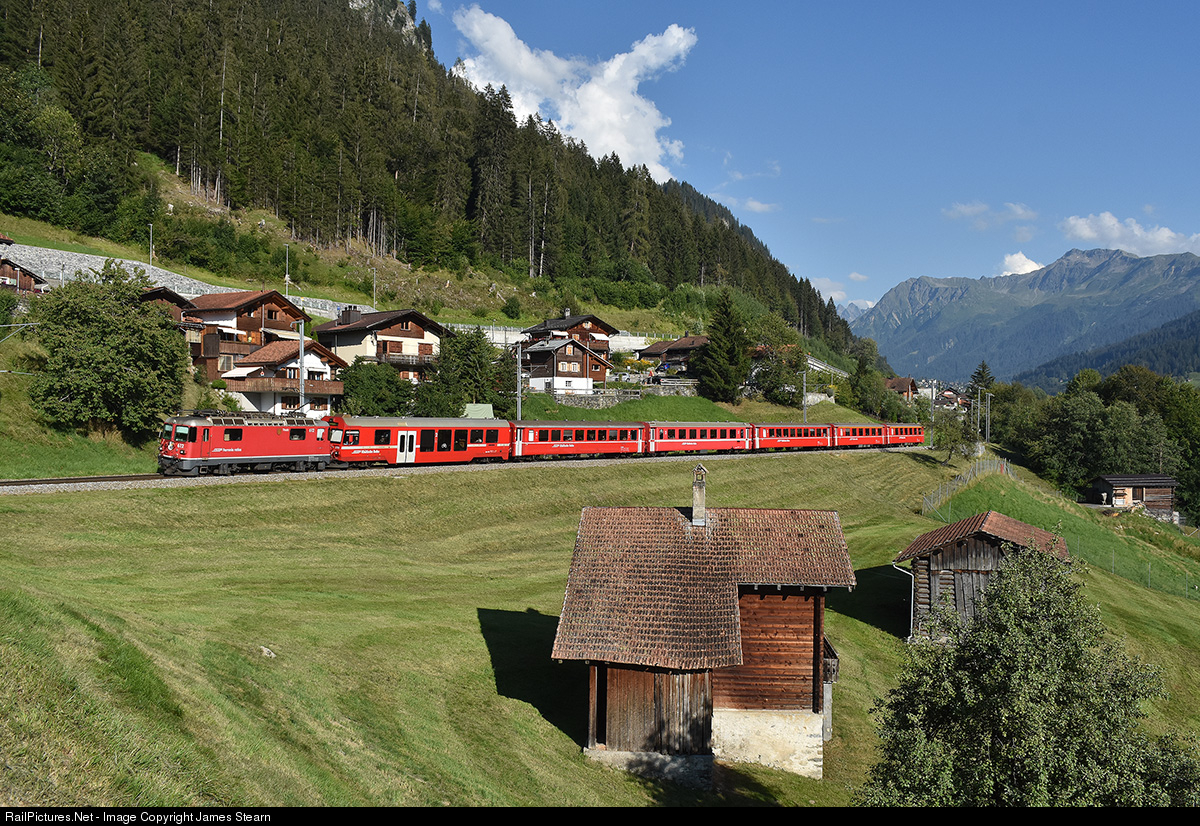 Ge4/4ii 612 'Thusis' passes typical Swiss scenery as it heads downgrade with a service from St. Moritz to Landquart. The photographers were certainly pleased to see the locomotive atop the cab control car which is at the front of the coach formation.