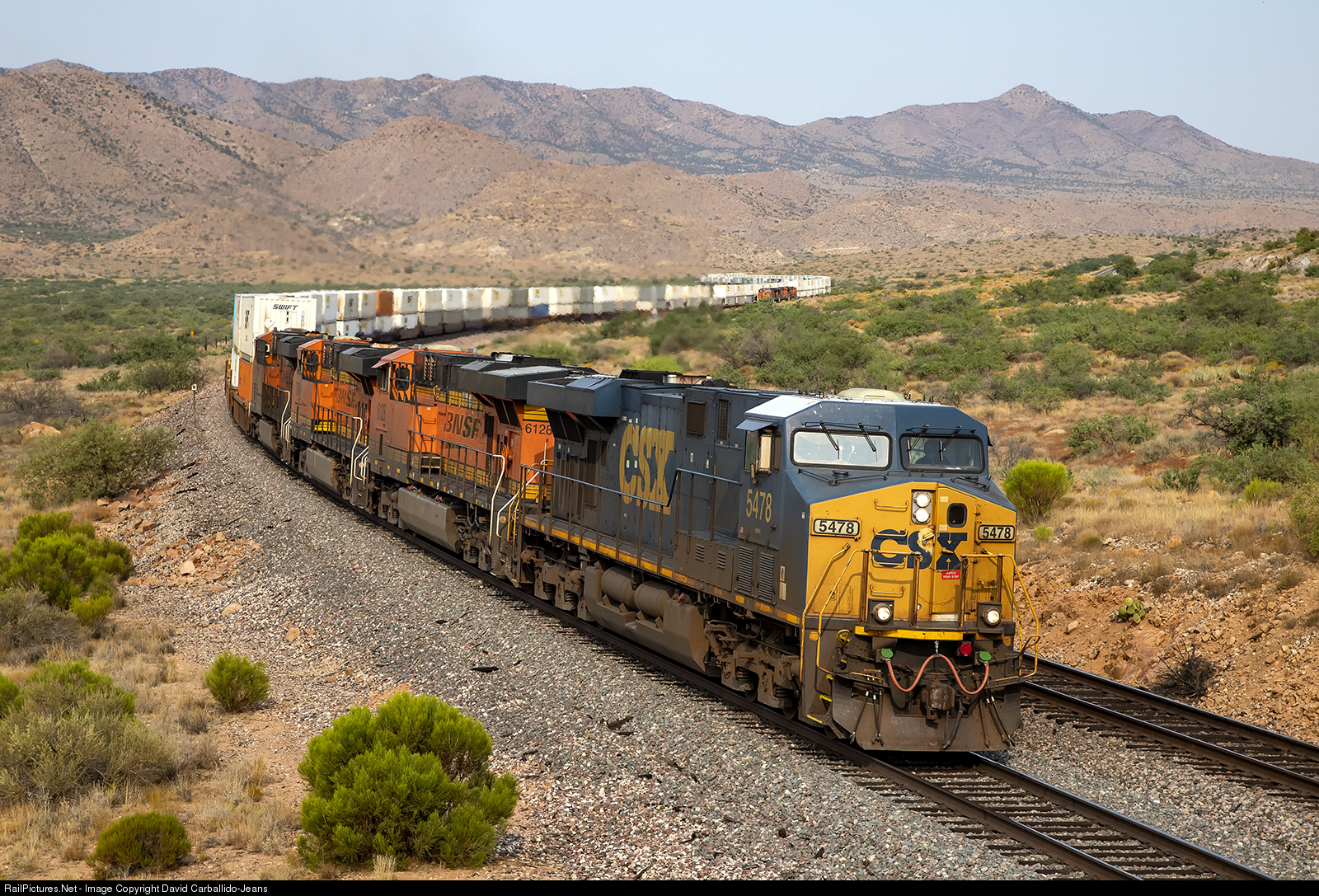 CSX 5478 makes a west coast appearance as it leads a hot Stockton, CA to Willow Springs, IL Z-train through the S-curve of Hackberry. In the background, the head-end of the Q STOCHI6 can be seen stopped at Hackberry Rd. where that crew, and the Z STOWSP7 crew, swapped trains. This practice is done when one crew is short on time. The crew off of the Q STOCHI (6 hours on duty) swapped with the Z train crew (3.5 hours on duty) in ordered for everyone to arrive into Winslow within their hours of service.