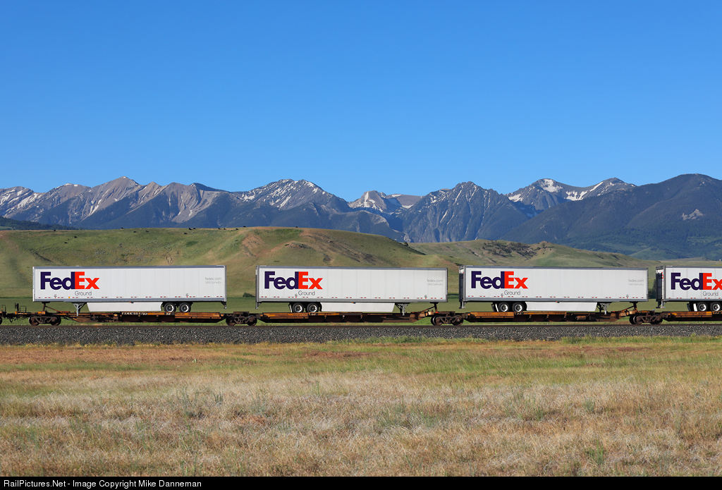 FedEx Ground trailers speed eastbound on a BNSF intermodal train on Montana Rail link’s Second Subdivision at Elton, Montana, on the morning of June 24, 2020. The rugged Absaroka Range mountains dominate the background.