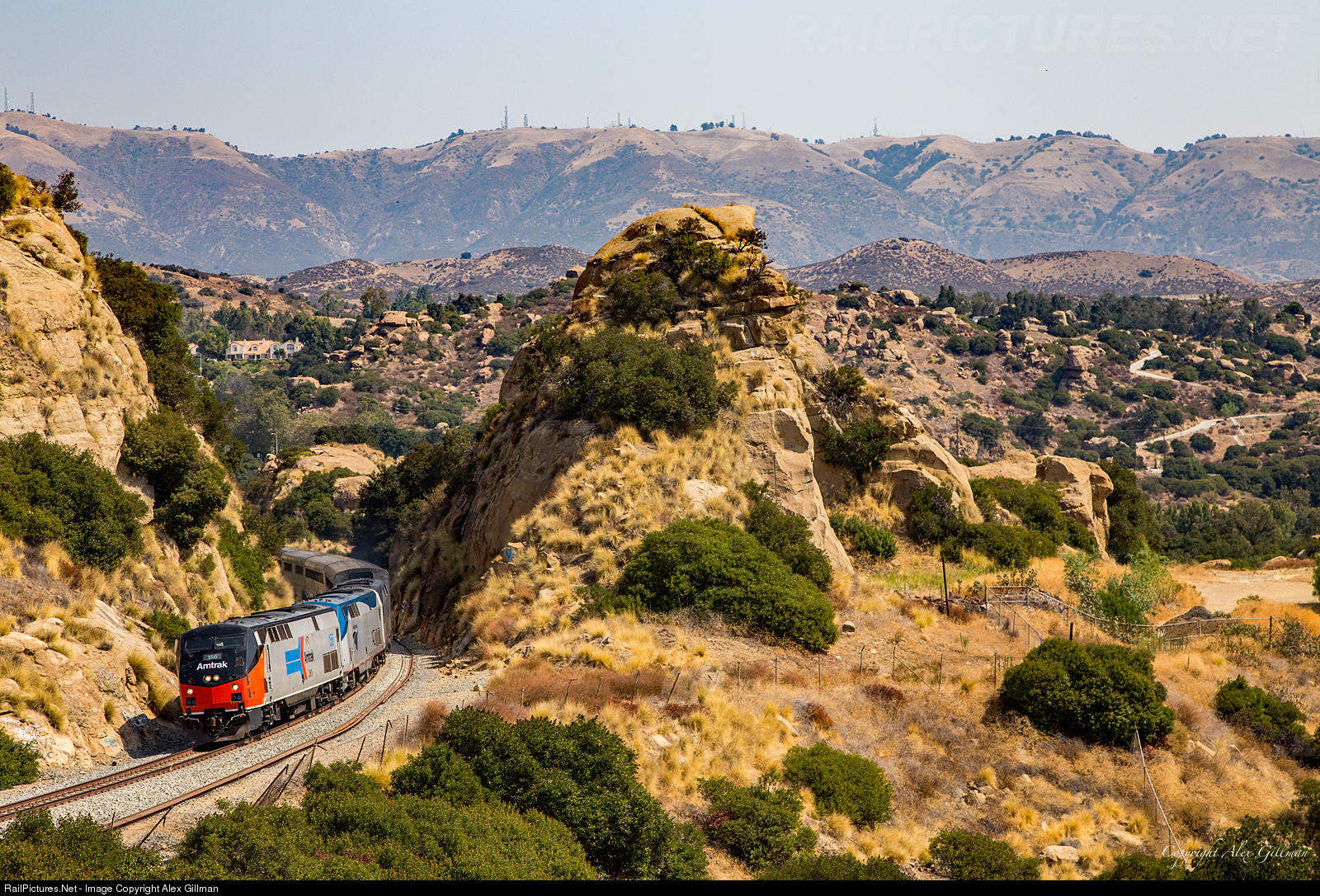 | Slicing through the smoke filled air, which has blanketed most of the San Fernando Valley as multiple brush fires burn across Southern California, AMTK 156 leads this morning's northbound Coast Starlight upgrade into Santa Susana Pass. The train is passing through a well known cut in the jagged rocks here that professional and amateur photographers alike would often frame the passage of the Southern Pacific's morning Daylight passenger train in the 1940's and 1950's. Out of the picture to the left is Tunnel 27 that the train will soon