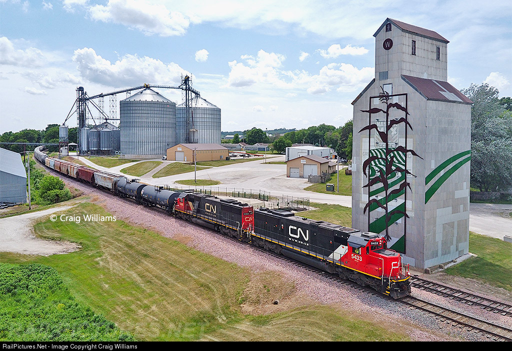 | With the virus affecting business this spring, CN had really cut back on people and service days thru out Iowa. The west end had been pretty much went to 3 days a week service including the jobs on the Omaha Sub. The 572 and 573 were running on Tues/Thur/Sat in which they meet at Dension in the afternoons and swap trains. With the cuts the job now have 2 units instead of the normal 1. The job out of the Bluffs is sporting 2 SD60's which was my main reason to visit western Iowa again. Here they pass a cool elevator at Woodbine on the way to Denison. |