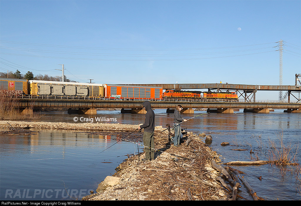 As the country shuts down more and more due to the Corona Virus, people have to find something to do with their time of isolation. This couple is spending a beautiful Sunday fishing along the Mississippi River at Fort Madison. They were kind enough to let me and my boy grab a shot of them as this Kansas City to Logistic Park vehicle train heads into Illinois as they cross the Mississippi River.