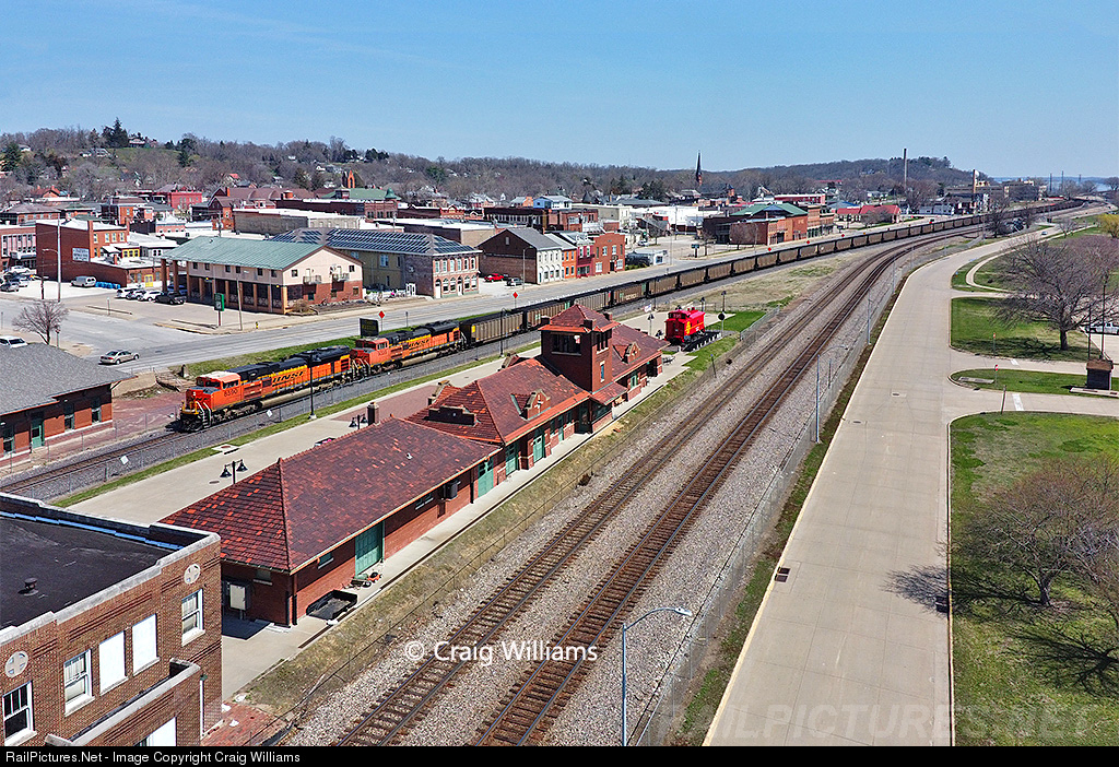 The area around Fort Madison offers alot of neat things to shoot from the ground and air. The Chillicothe Sub takes off from the BNSF depot and runs along the Mississippi River for a few miles before crossing it into Illinois. In those few miles the railroad passes this old ATSF depot and the city park full of interesting items. Also in the mix is the Hannibal Sub that parallels the Chilli Sub thru here for about a mile. A westbound (south) coal train making its way back up to speed after slowing for the 10 mph permanent slow order near the river bridge on the Hannibal Sub. This train is working from Burlington, IA, to West Quincy, MO, for the next crew change. Sounds like work is under way to get this 1912 ex-Santa Fe depot back in service for an Amtrak Stop. Currently the depot is used by the North Lee County Historical Society for museum.