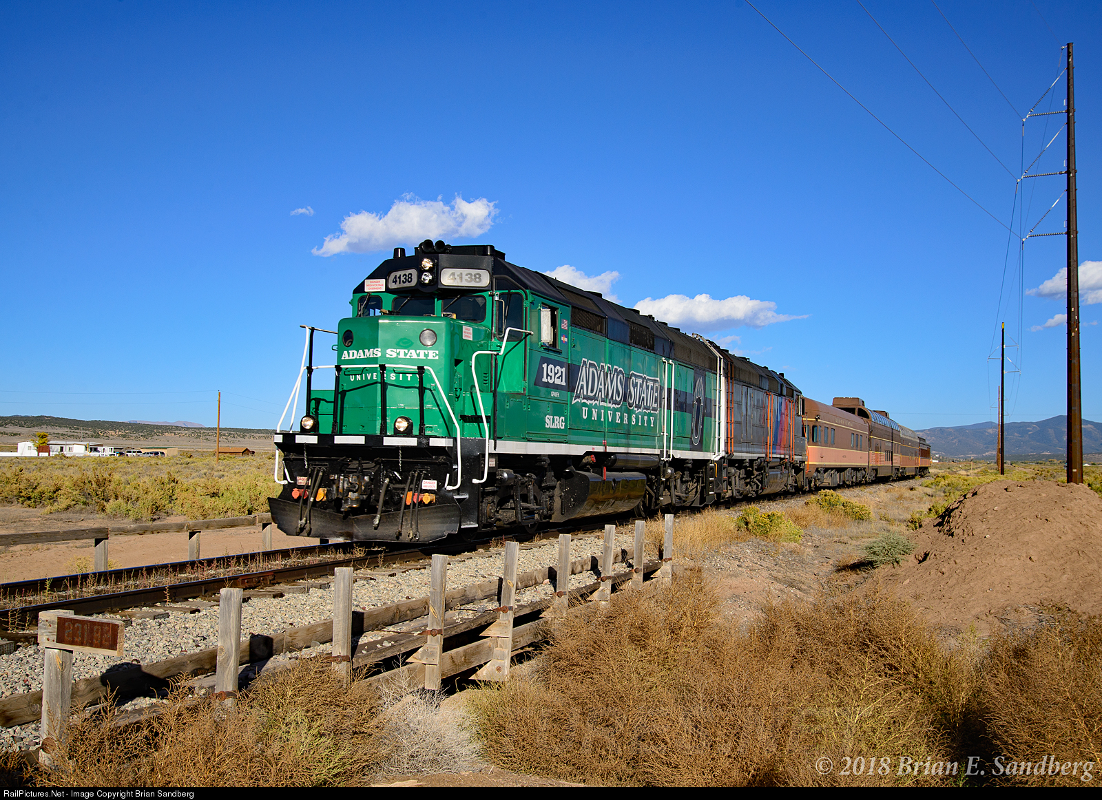 SLRG GP40PH-2 #4138 and 4136, ex NJ Transit, are returning to Alamosa, CO with a passenger run from La Veta Pass at Blanca, CO 9/26/18. The 4138 is wrapped for Adams State University located in Alamosa.