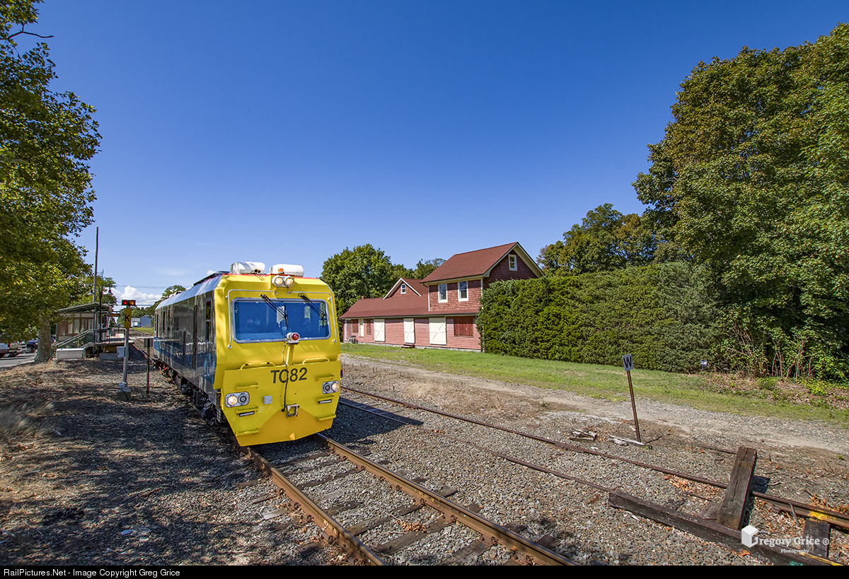 Long Island Rail Road's "TC-82" Track Geometry Vehicle heads east past the K Block Limit on the Main Line in Mattituck, NY. The TC-82 is a Track Geometry Vehicle built by Plasser American Corporation for track inspections throughout the Long Island Rail Road system. |