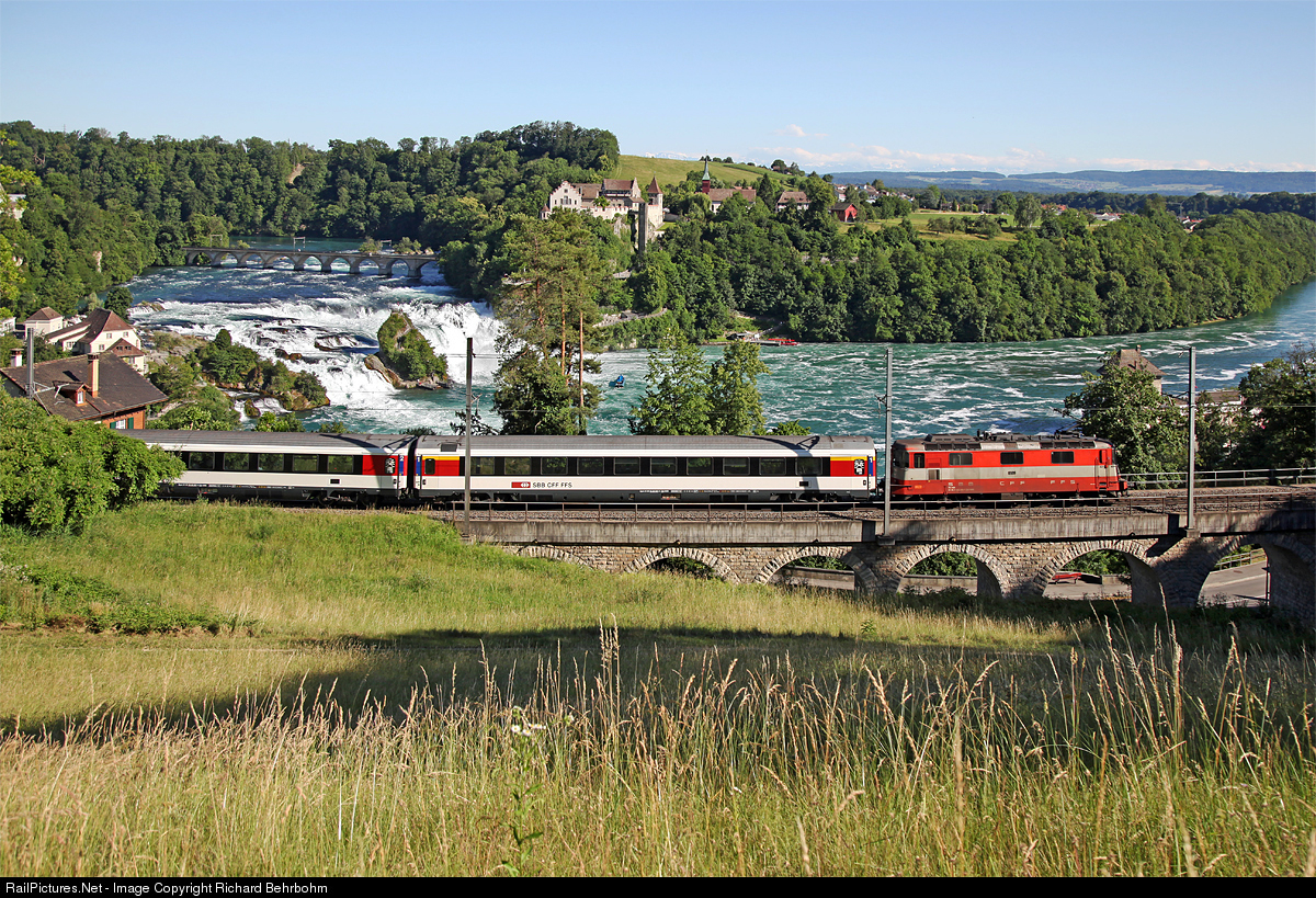 | Above the Rhine Falls Re 420 109 in "Swiss Express" paint scheme heads Intercity Line 4 Singen - Zurich. |