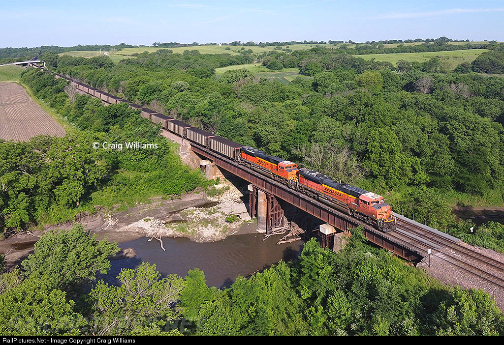 A loaded coal train works east on the Creston Sub in southwestern Iowa. The train crosses the Nodaway River just west of Nodaway. The train is bound for unloading Joppa, IL, for Electric Energy. This is 1st load of 4 coming east behind Amtrak out of McPherson. Think this is kind of cool how the BNSF has reinforced this bridge.