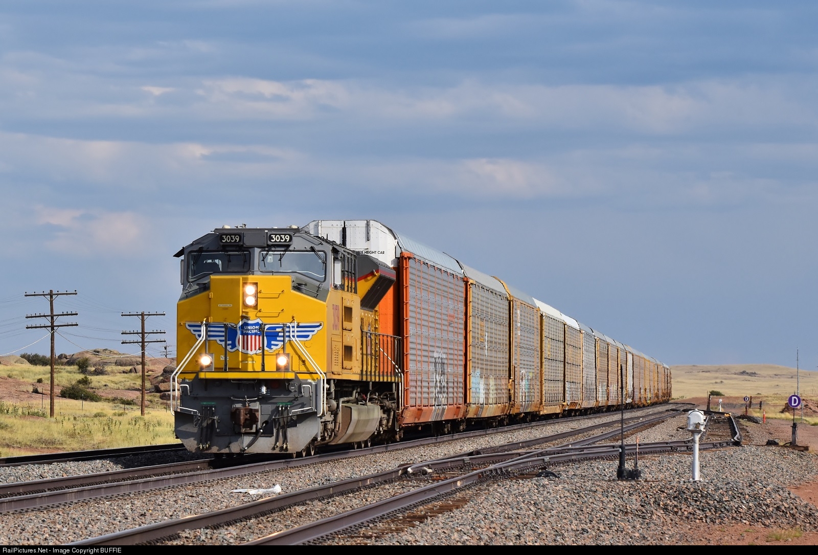Empty auto racks are handled by UP 3039 (SD70AH) as it runs through Hermosa, Wyoming.